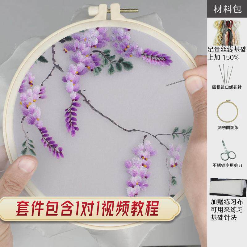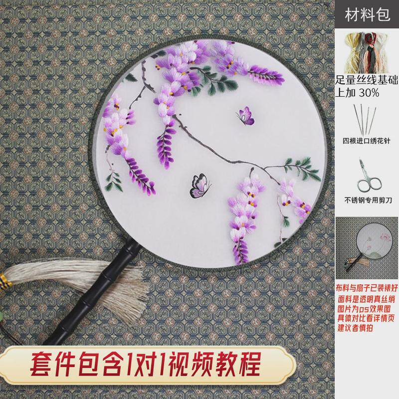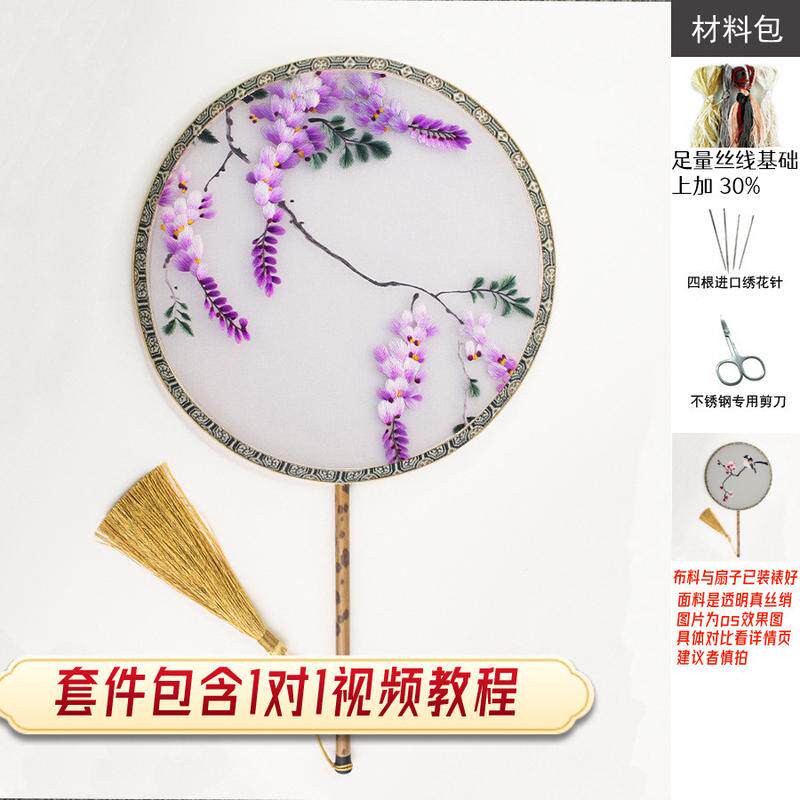 y5ug批发苏绣手工diy自绣套件紫藤花鸟子印图团扇刺绣材料包蜀绣
