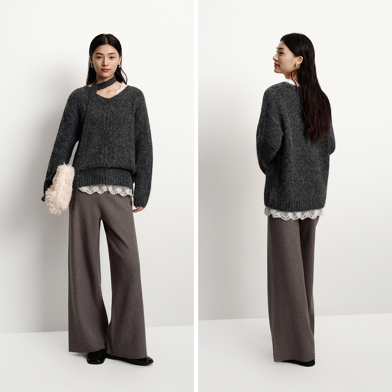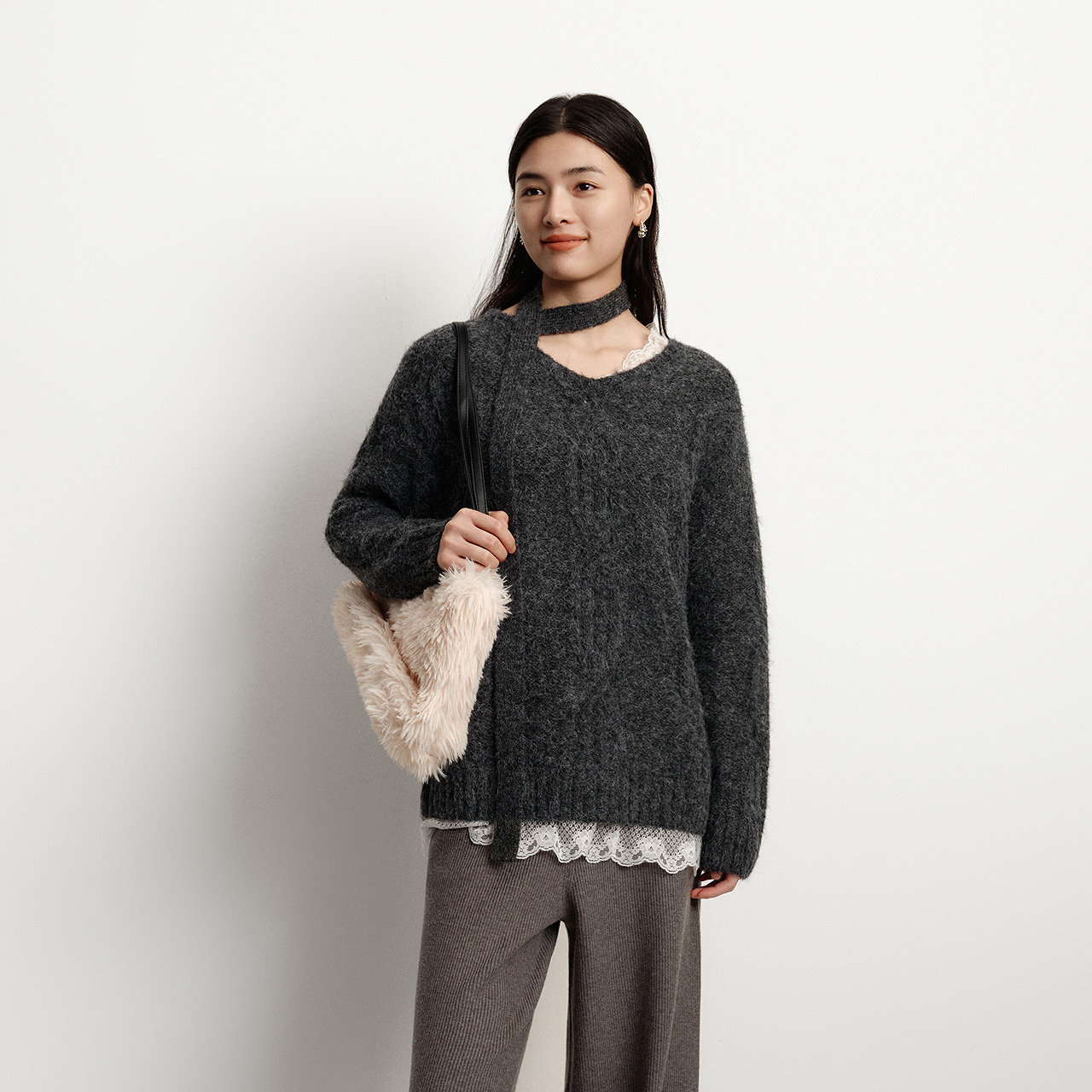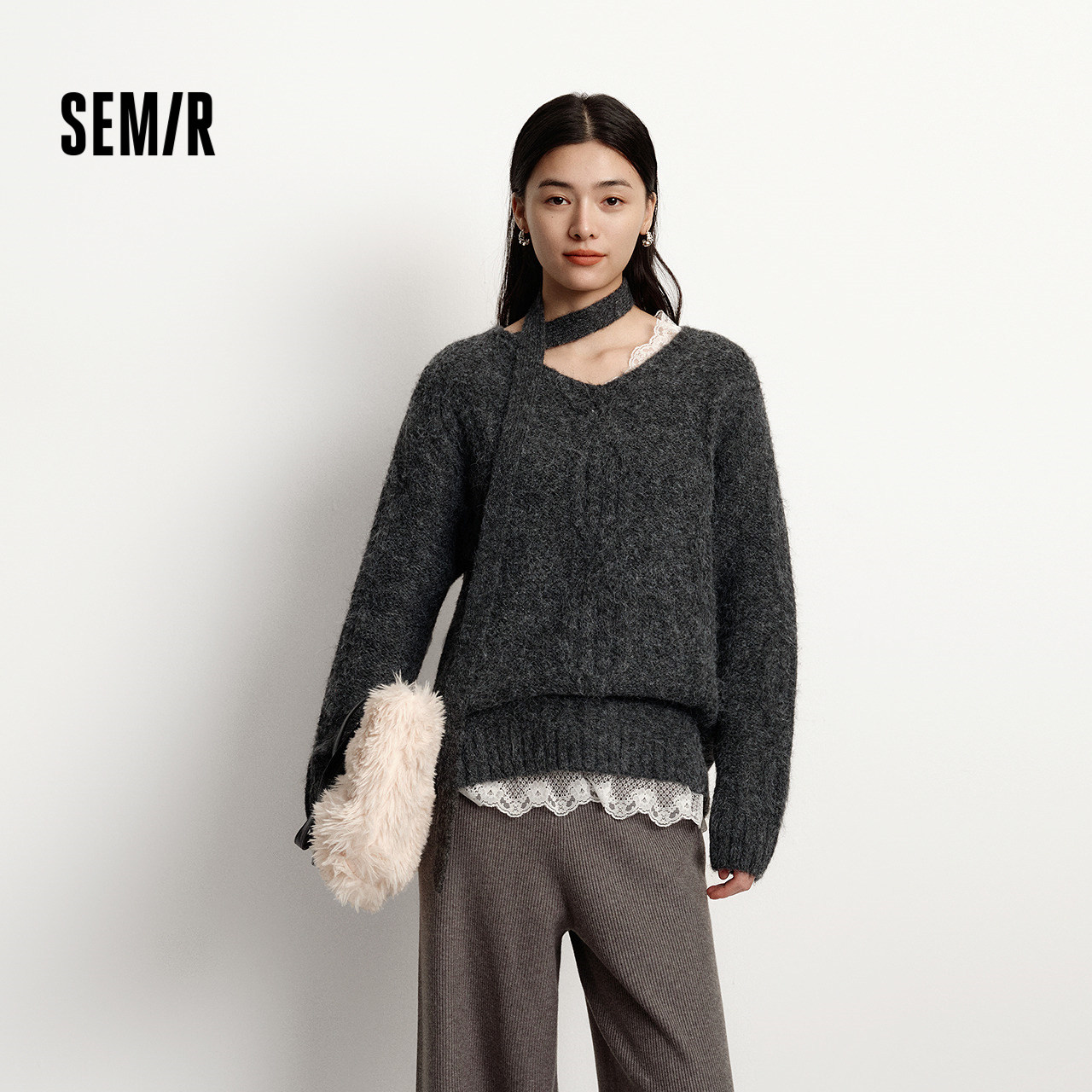 森马毛衣女冬围巾蕾丝V领绞花宽松2025新款慵懒优雅小性感套头衫