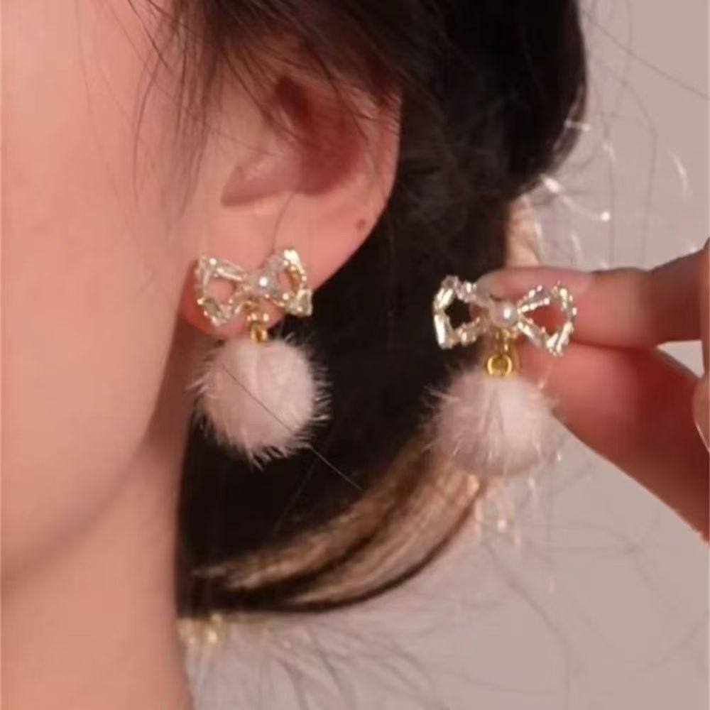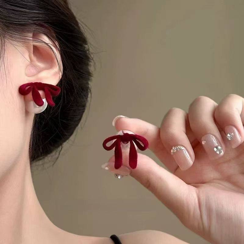 植绒红蝴蝶结珍珠耳环女耳钉2026新款爆款圣诞高级感耳饰品
