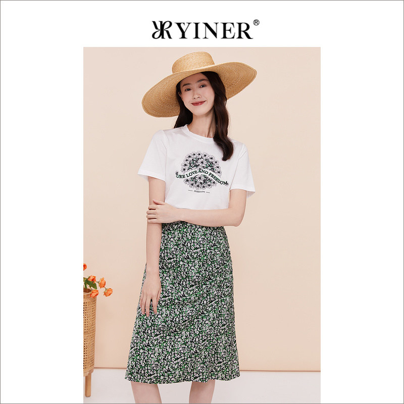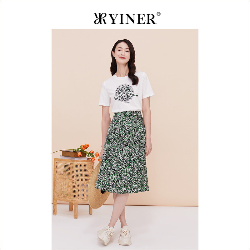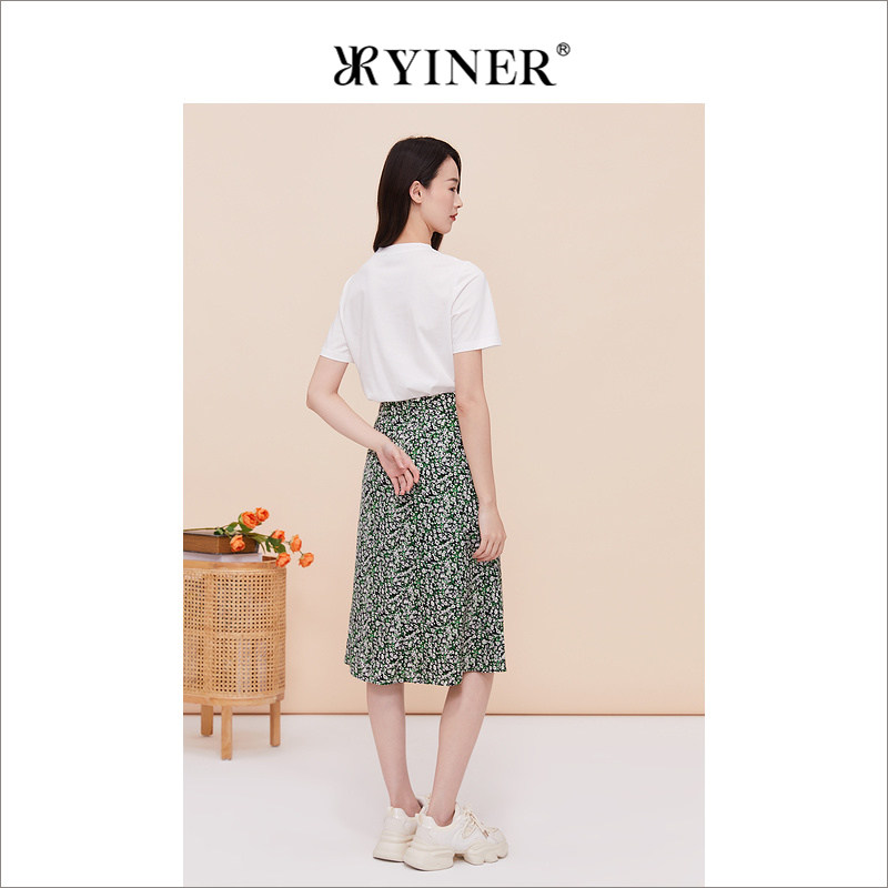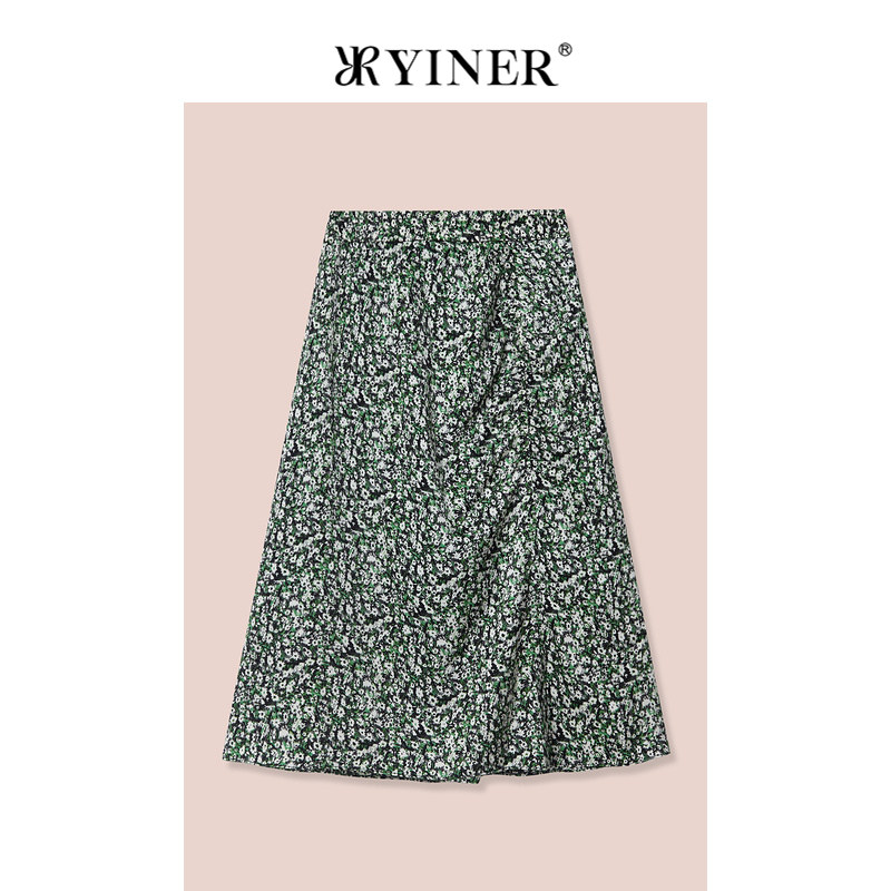 YINER音儿专选女装夏季时尚法式收褶印花过膝半身裙