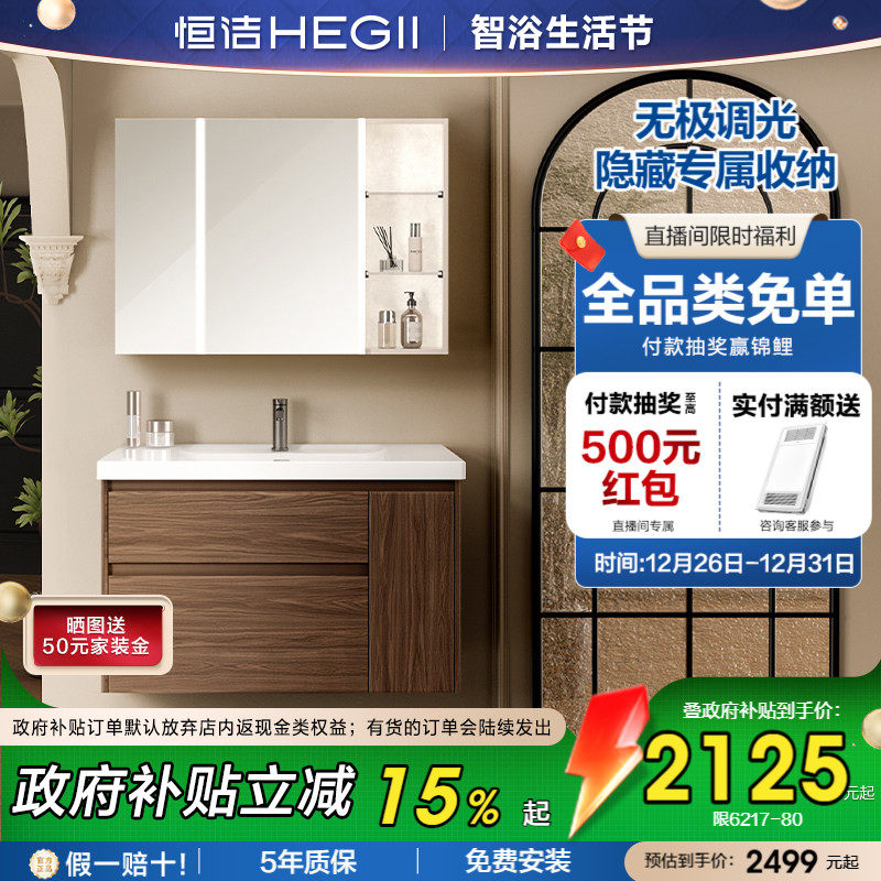 恒洁卫浴中古风浴室柜组合卫生间洗手台智能镜柜陶瓷一体盆