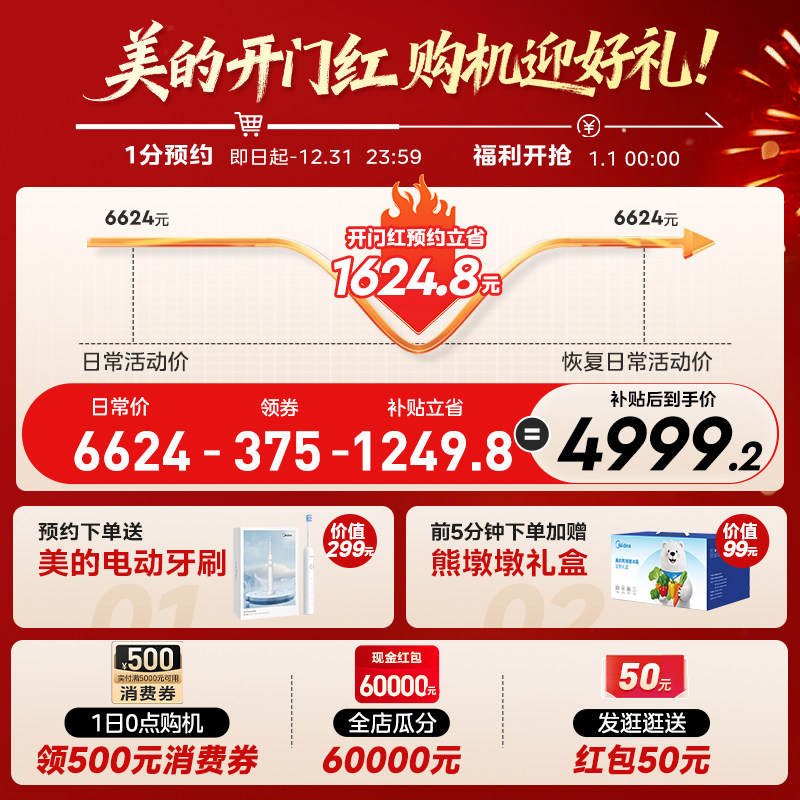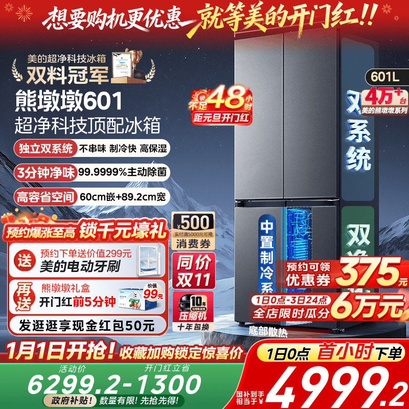 美的熊墩墩601双系统超薄零嵌入式十字四门双开门家用大容量冰箱