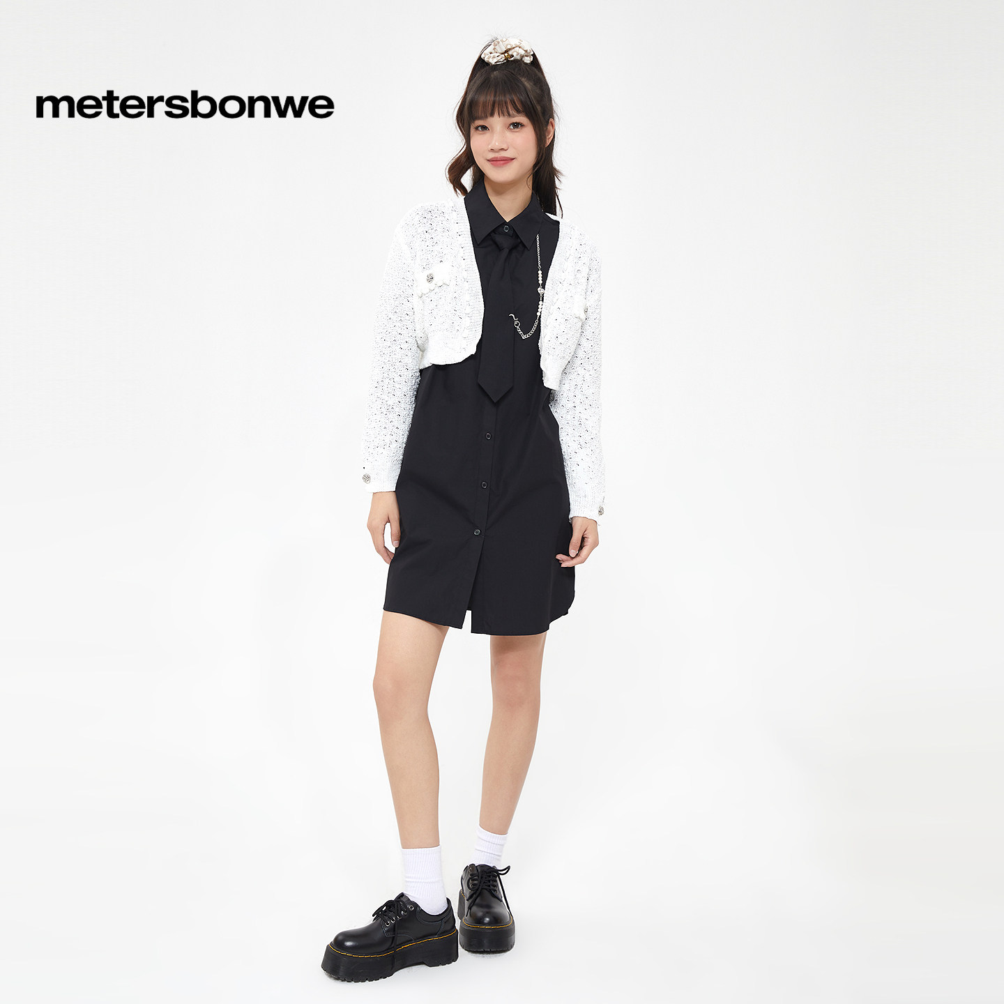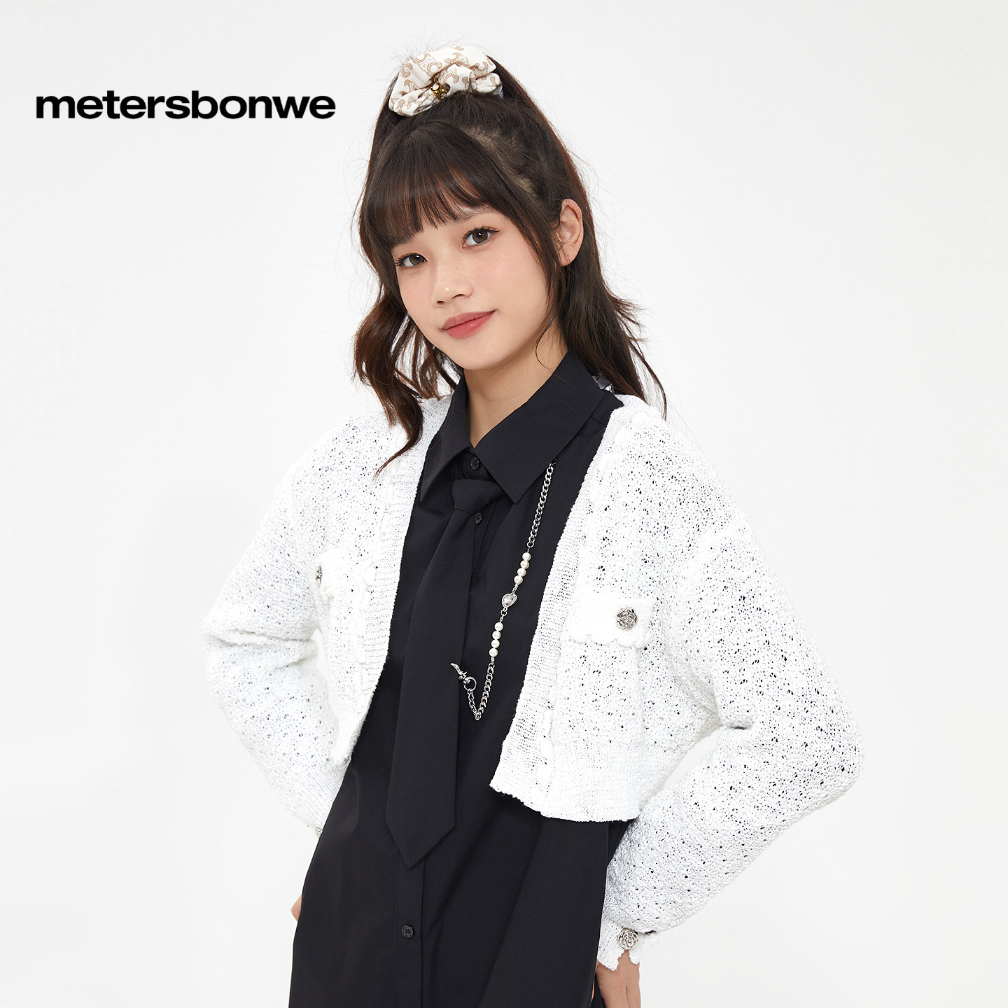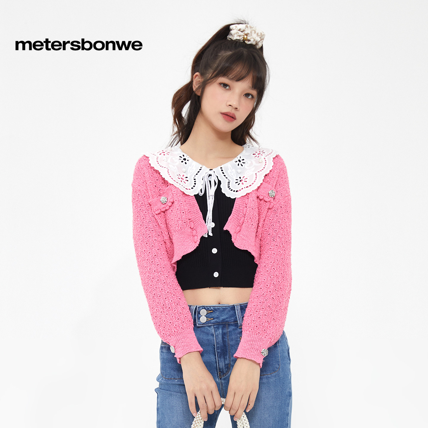 美特斯邦威毛衣女秋季甜美拼接圆领舒适开衫学院风长袖修身针织衫