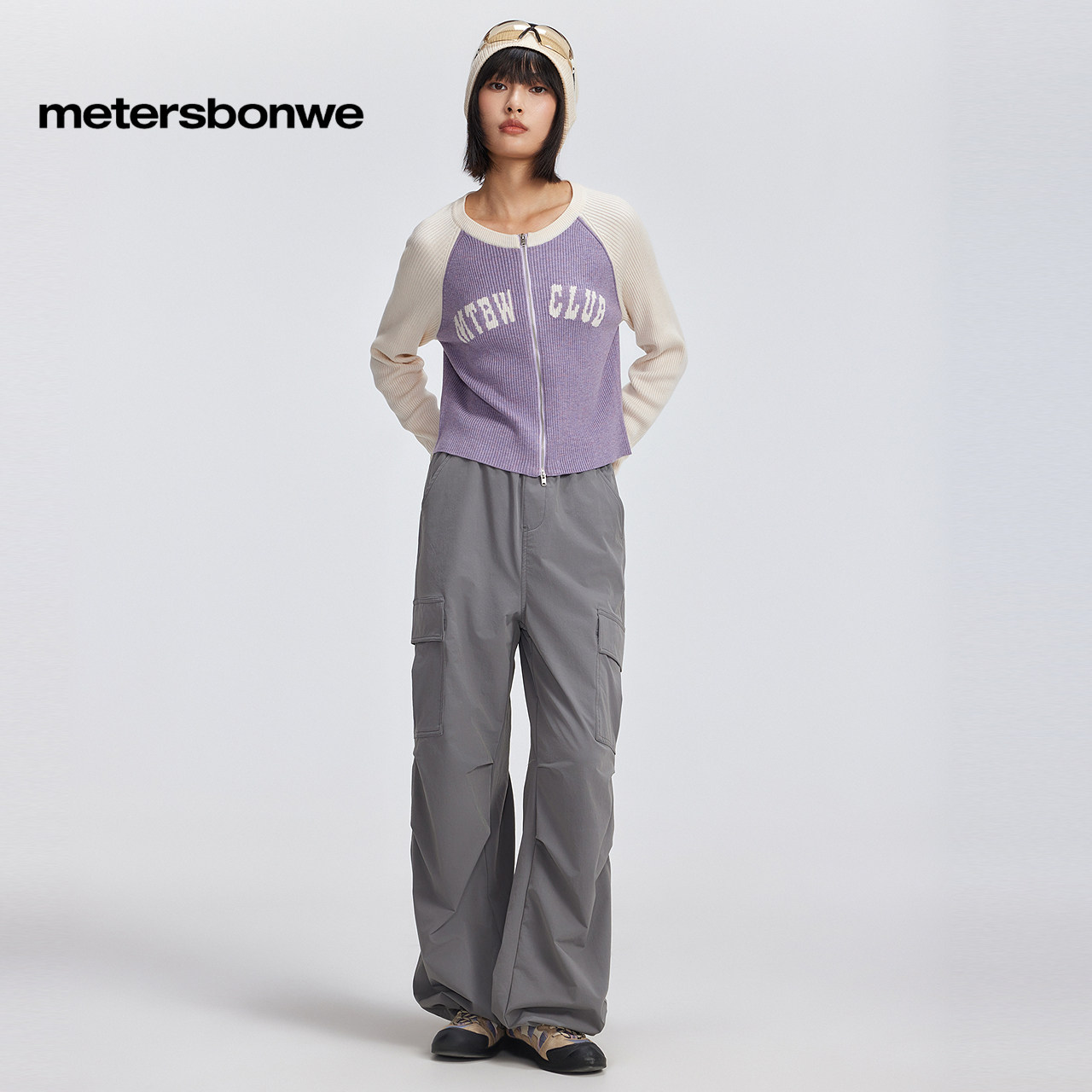 美特斯邦威撞色插肩袖开衫女春秋新款针织时尚辣妹开衫潮流短上衣