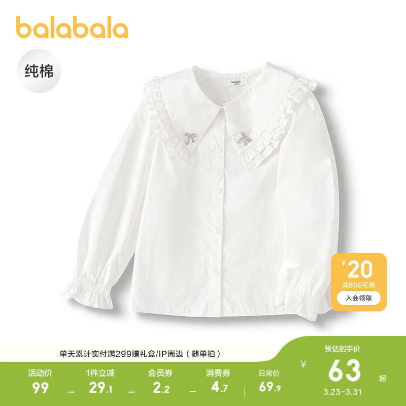 巴拉巴拉童装女童长袖衬衫春装纯棉衬衣时尚木耳边甜美大翻领舒适