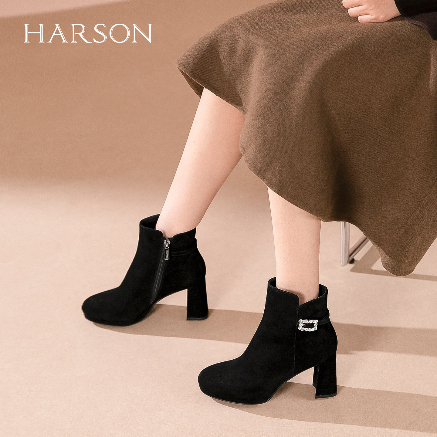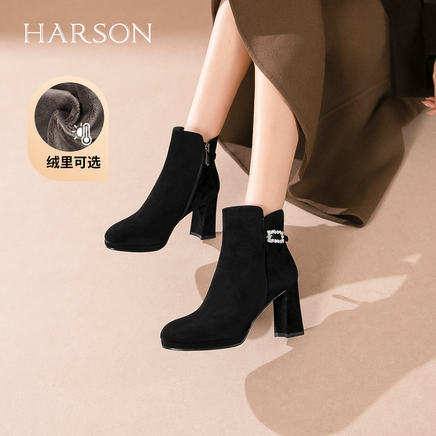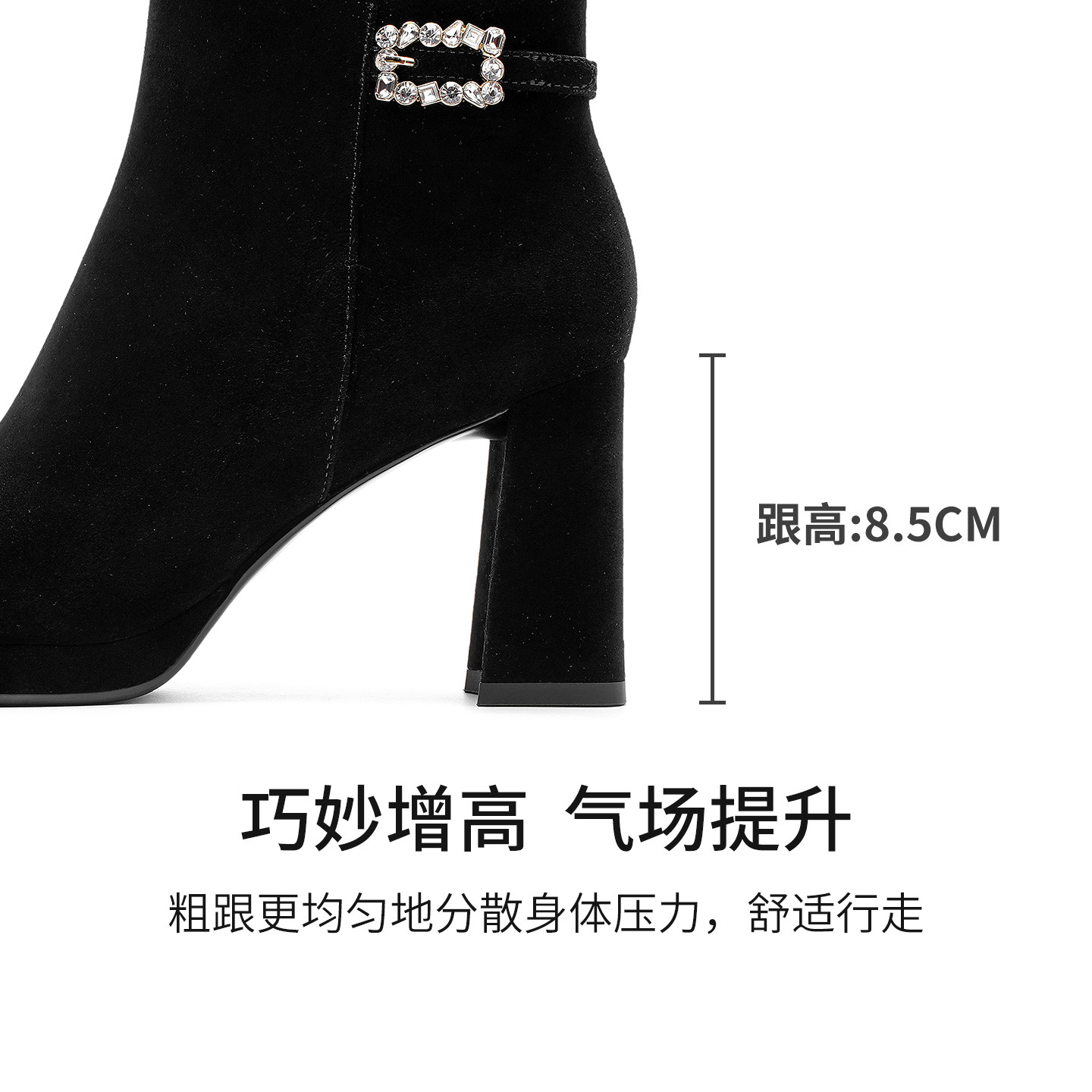 哈森气质水钻时装靴女2025秋冬新款粗跟增高短靴HA259907