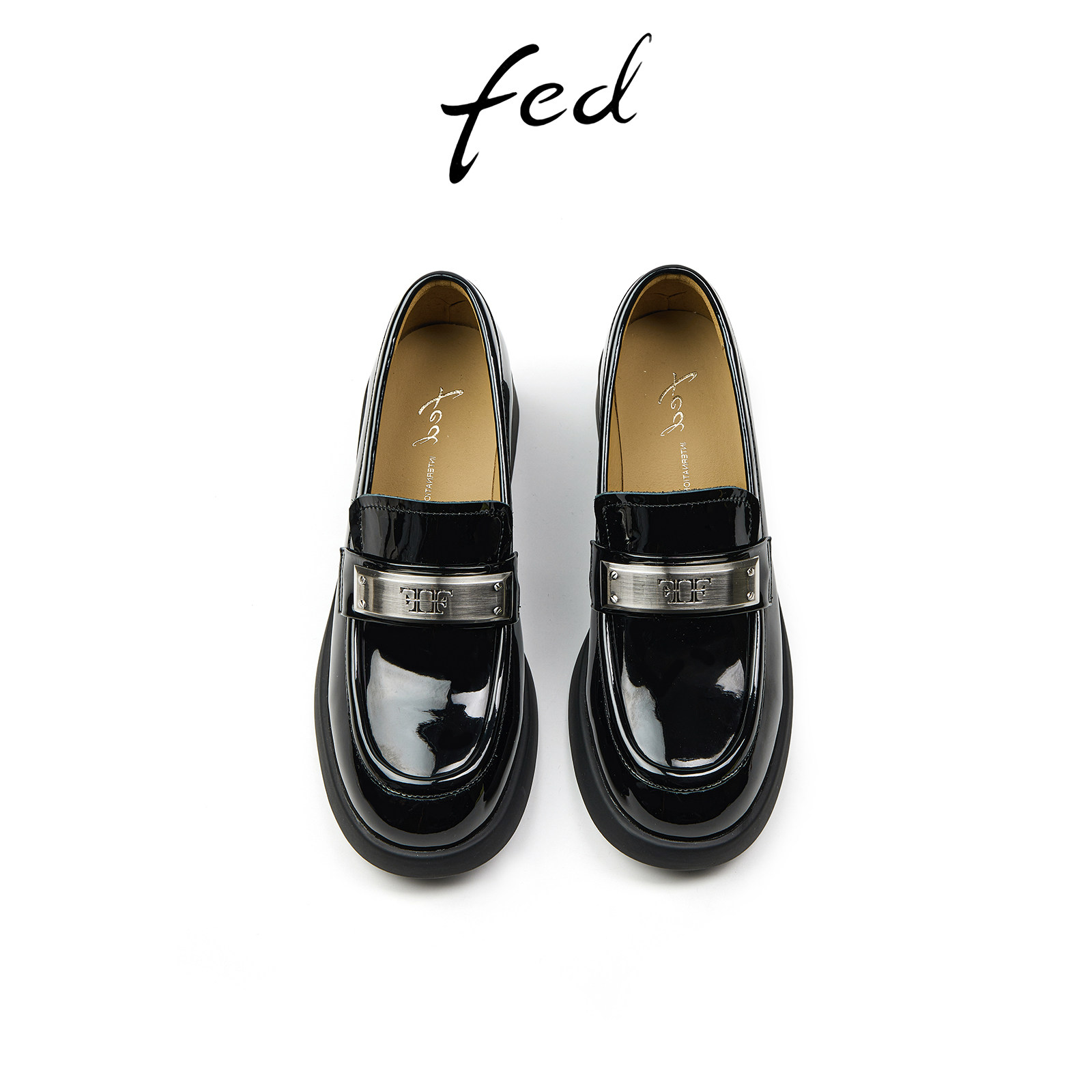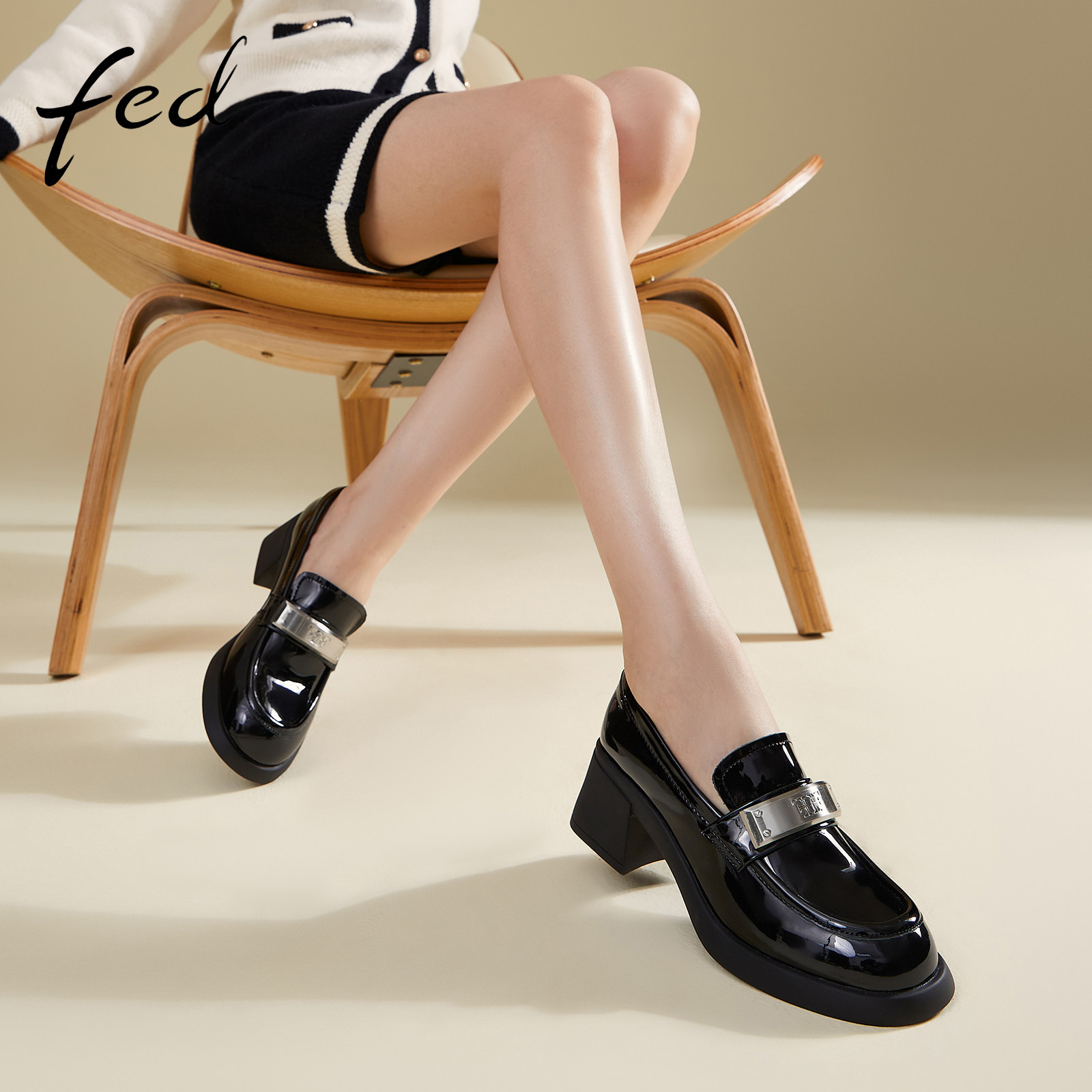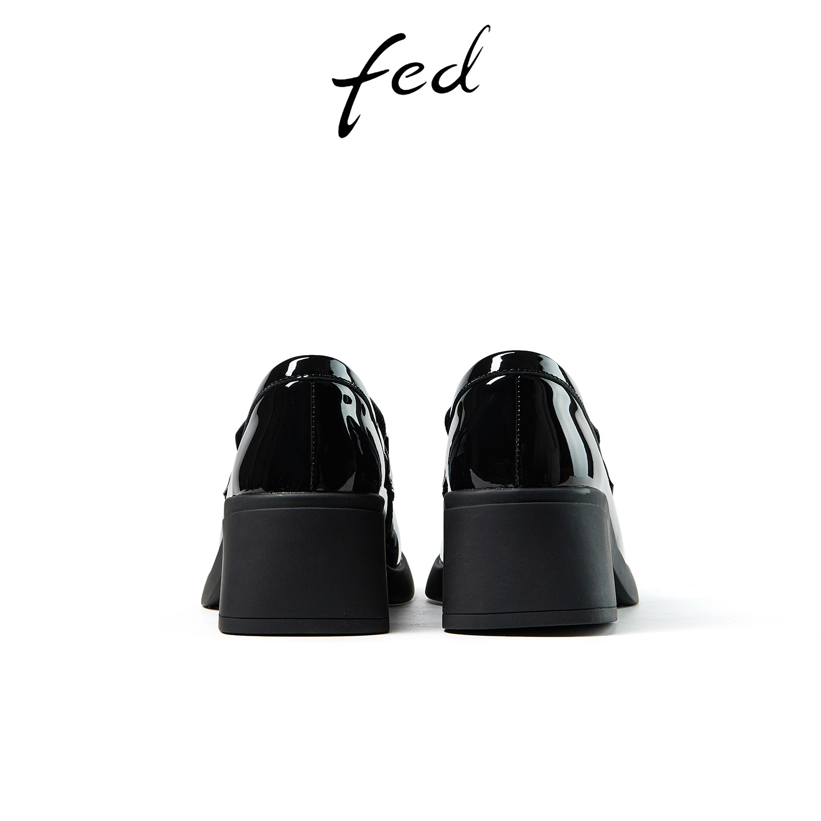 fed黑色小皮鞋春季新款女鞋一脚蹬粗跟单鞋乐福鞋女款D0224-YA360