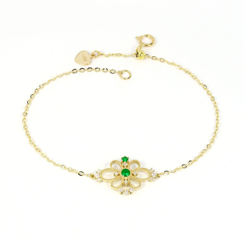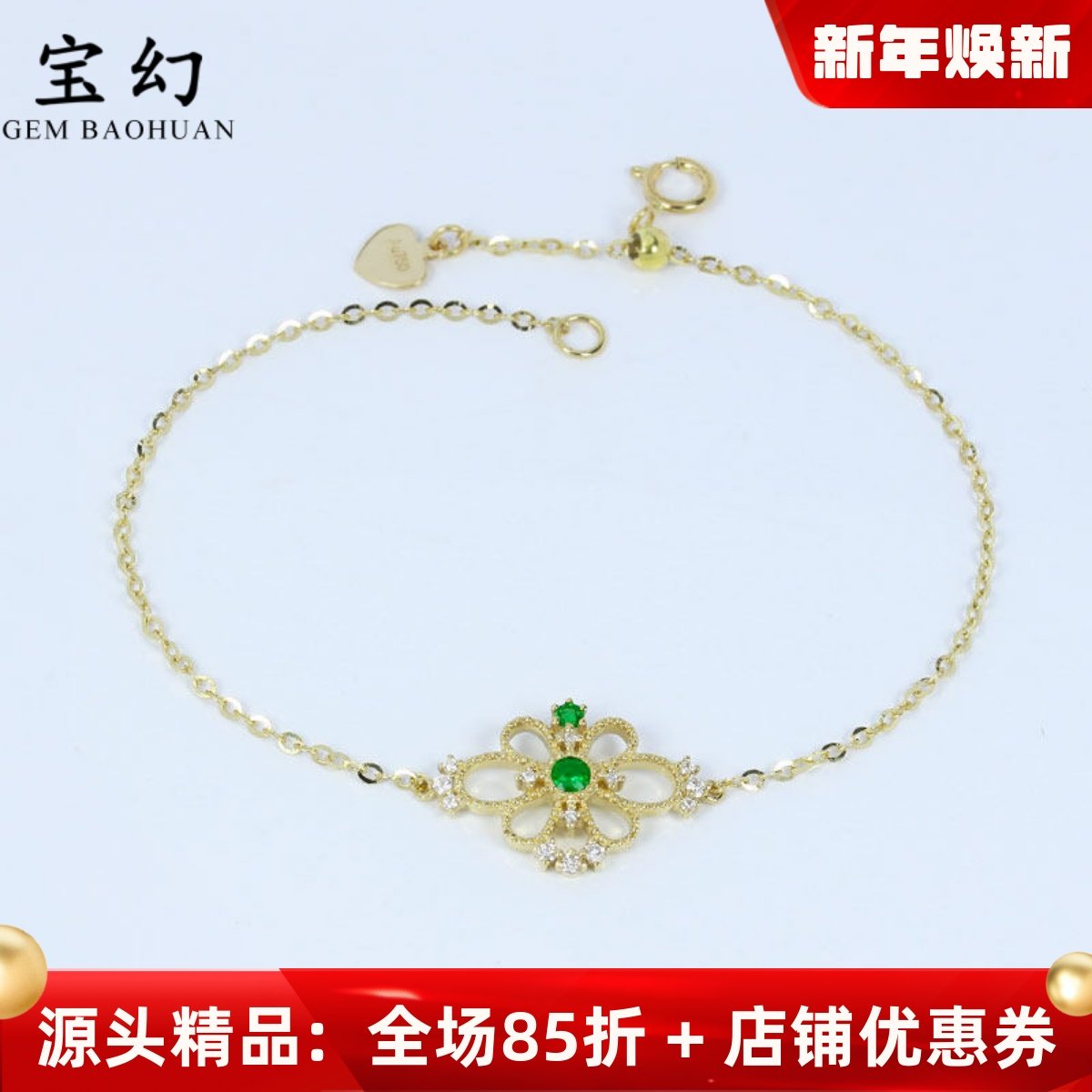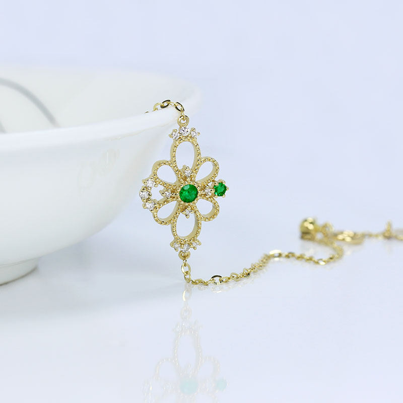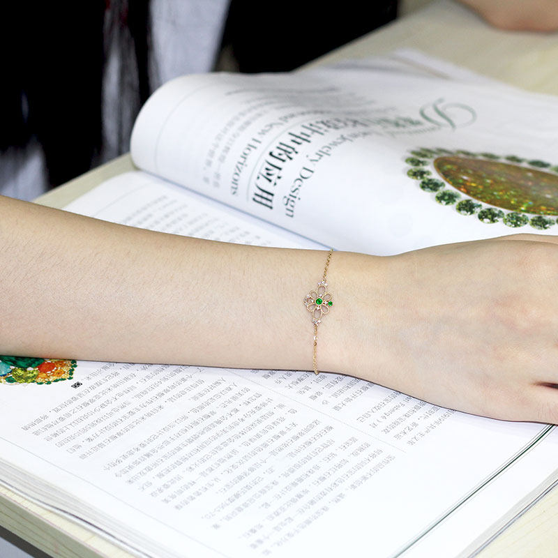 18K黄金天然祖母绿镶钻石复古手链 彩金翠亮绿色宝石小清新可调节