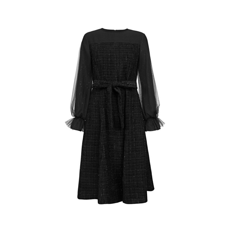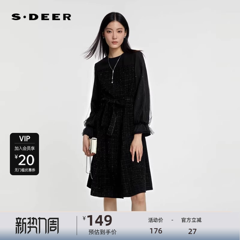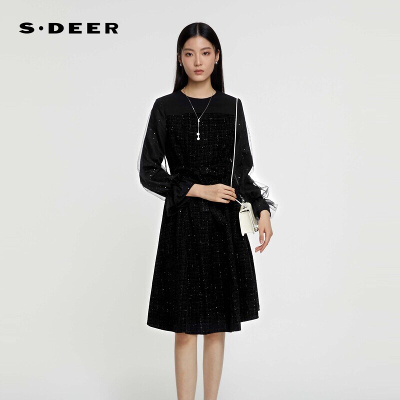 sdeer圣迪奥女装小香风圆领收腰网纱连衣裙S224Z1207