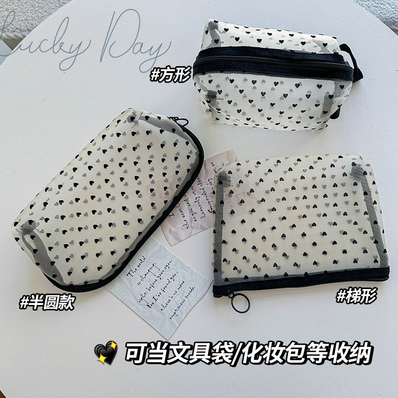 植绒网纱化妆包爱心便携随身口红补妆包大容量旅行收纳加大洗漱包