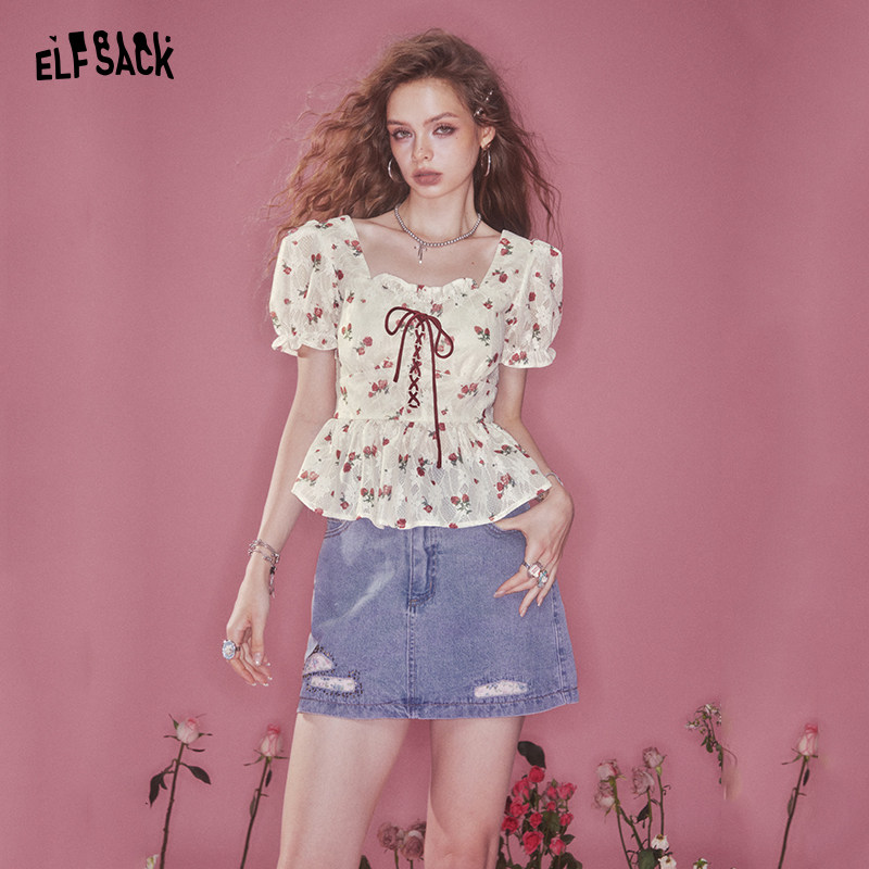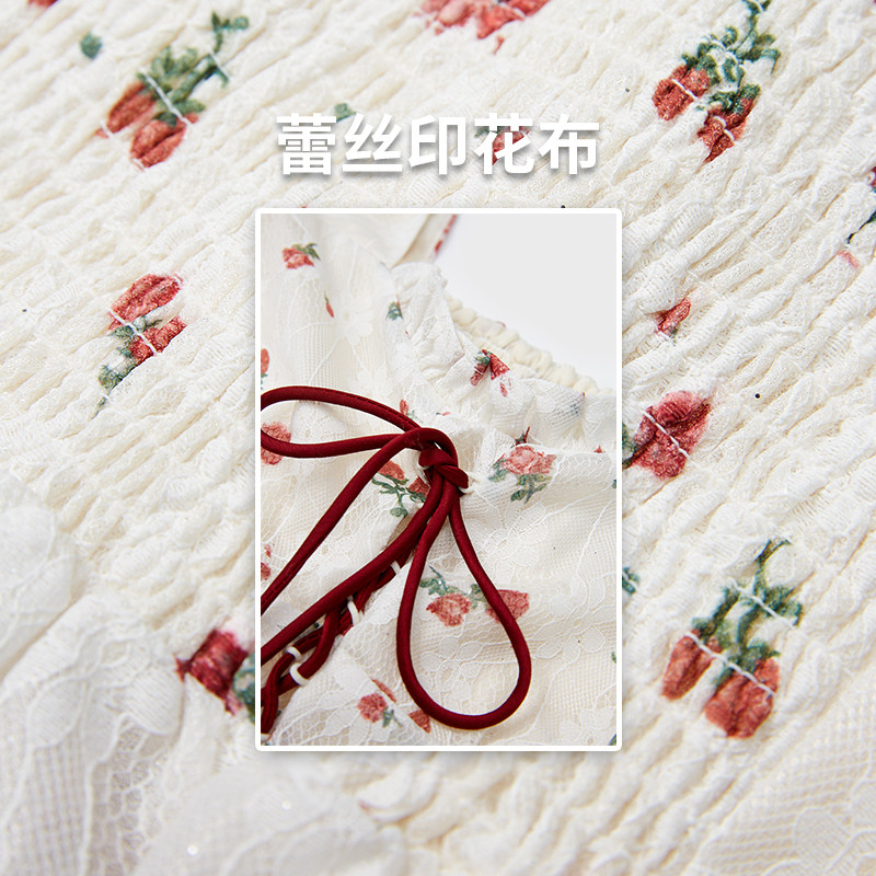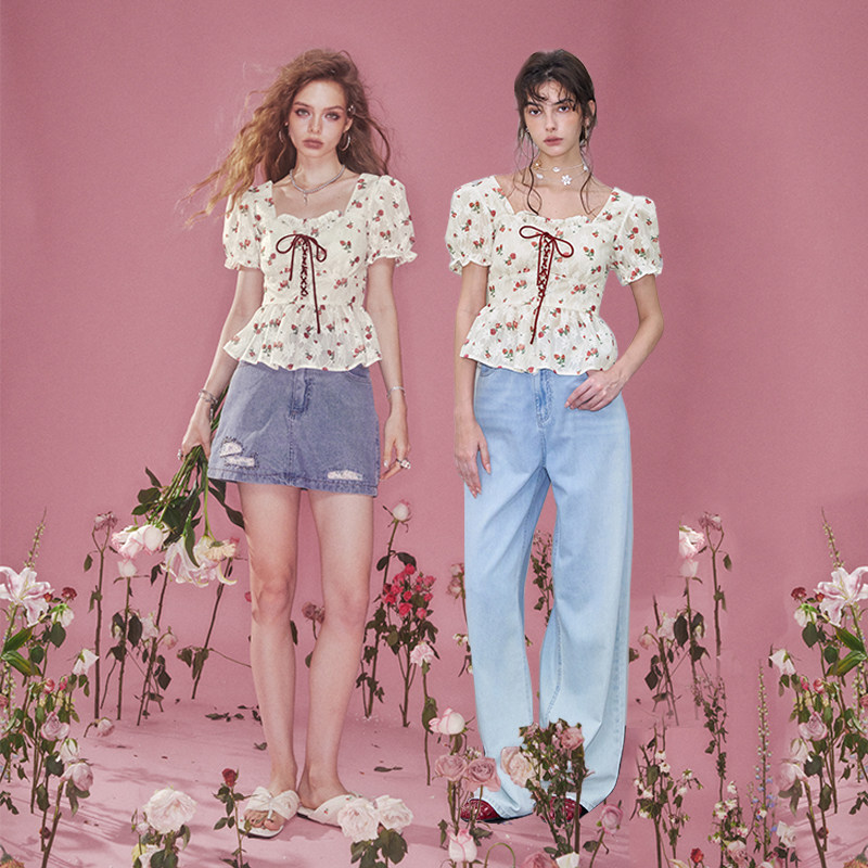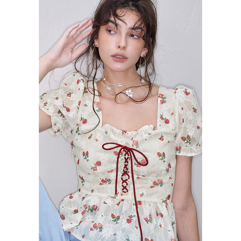 妖精的口袋碎花泡泡袖法式蕾丝衫女2025年夏季新款宫廷风甜美上衣