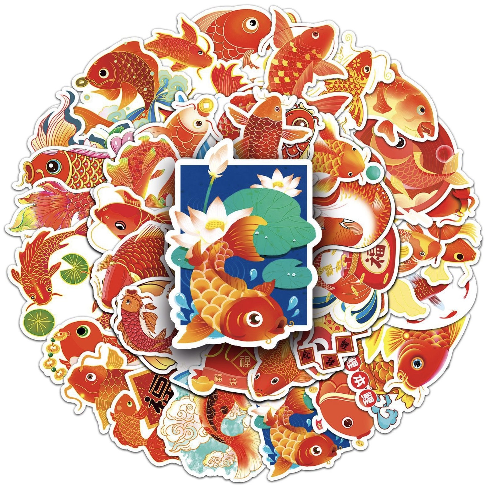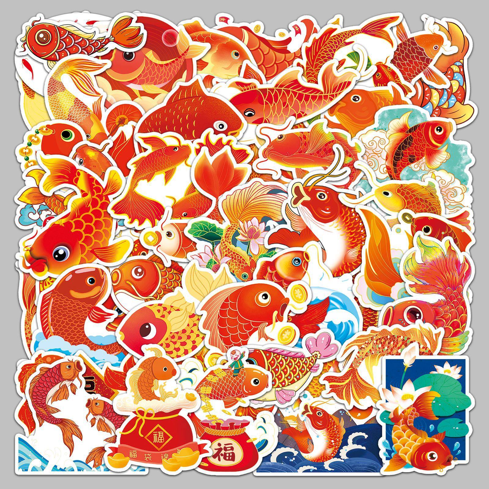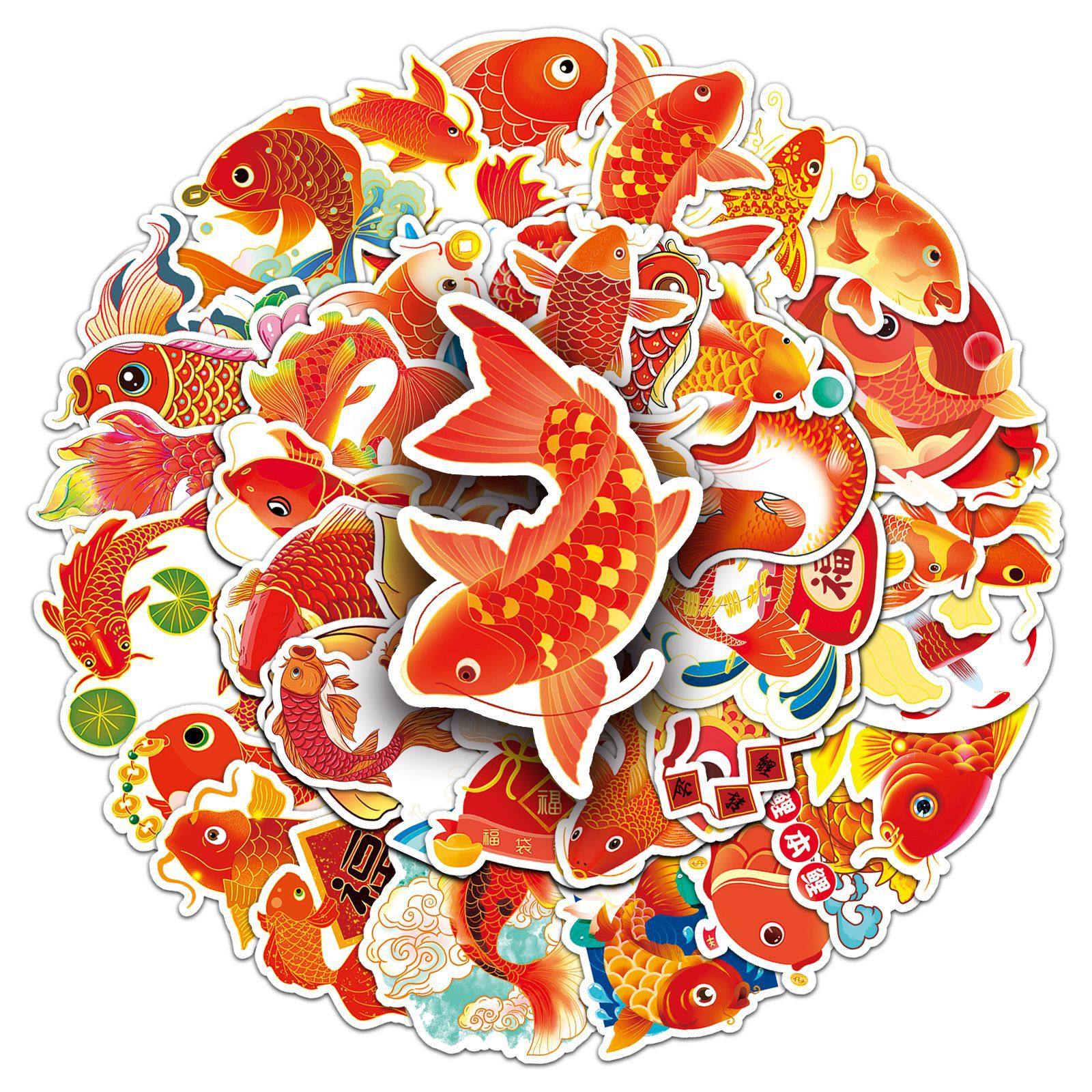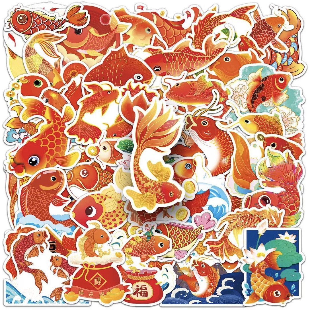 50张锦鲤贴纸鲤鱼金鱼新年春节中国喜庆动物装饰手帐卡通儿童奖励