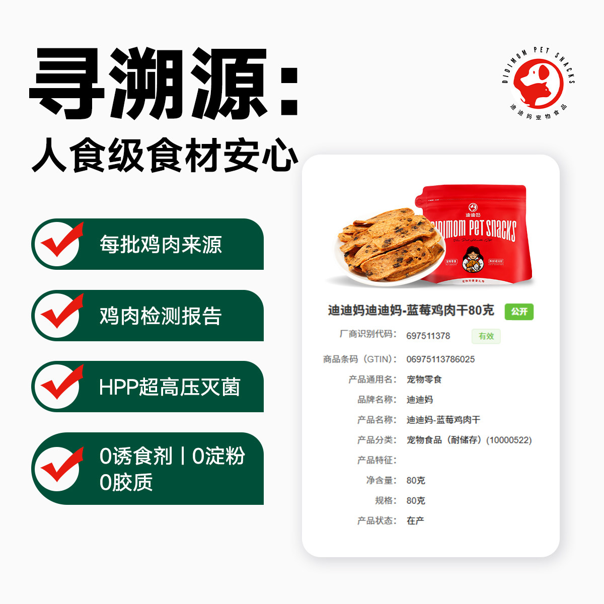 迪迪妈狗狗零食鸡肉干蓝莓西兰花果蔬肉干小狗的零食小型犬磨牙棒
