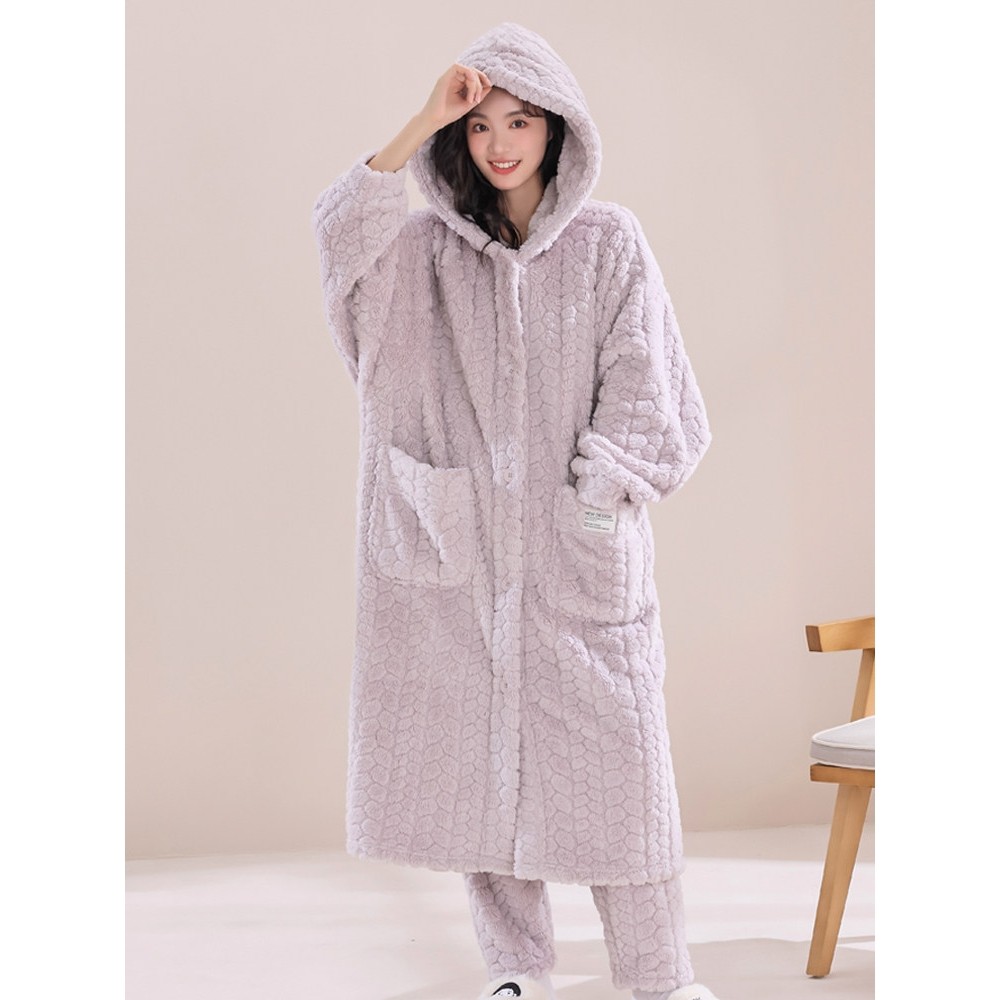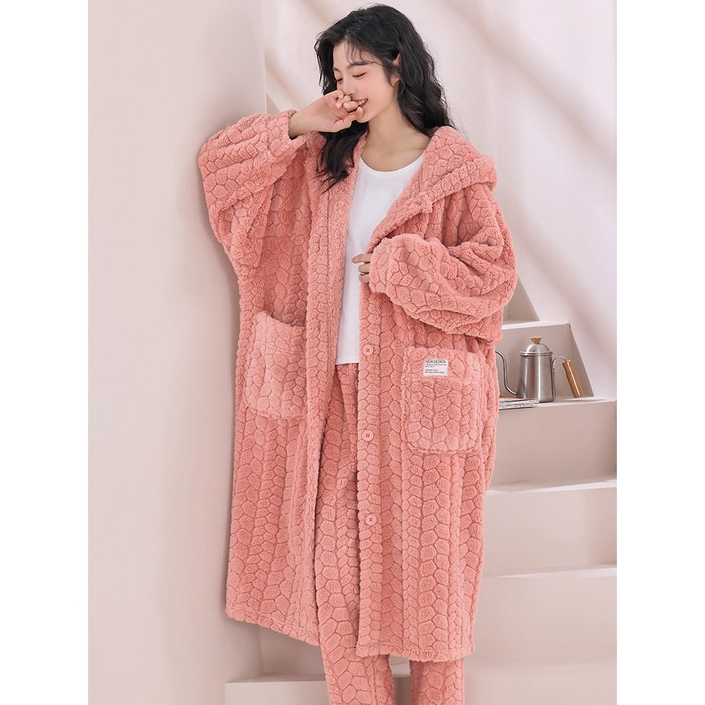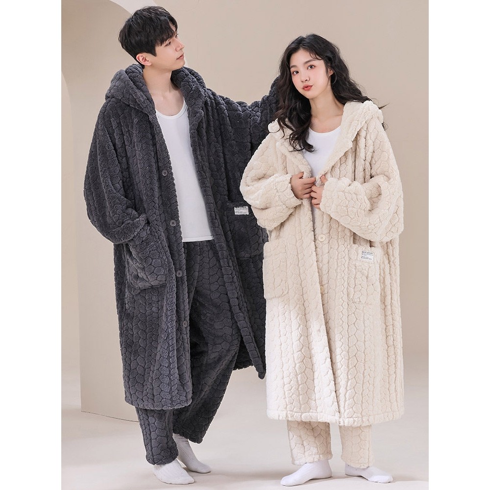 红豆秋冬季珊瑚绒连帽情侣睡衣男加绒加厚浴袍韩版可爱大码睡袍女