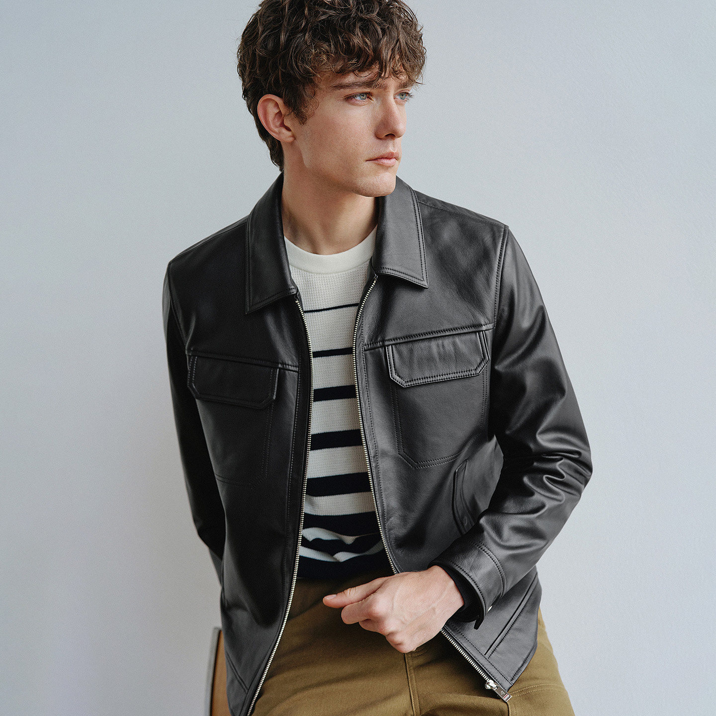 Navigare意大利小帆船老钱风牛皮皮衣男士春秋季新款翻领真皮夹克