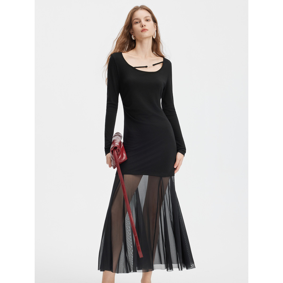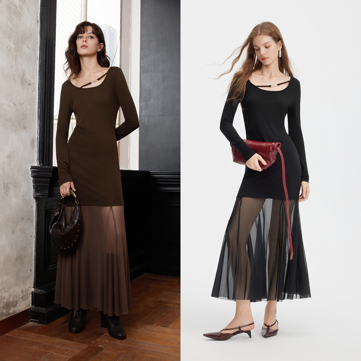 ELLE法式复古网纱拼接连衣裙女2025秋季新款绵羊毛优雅显瘦长裙