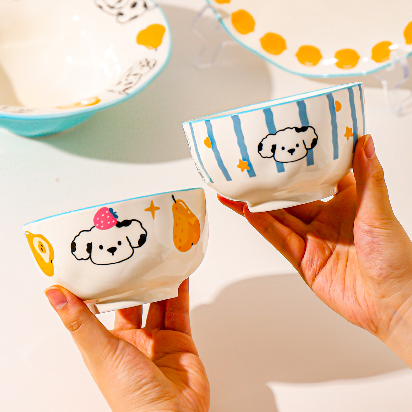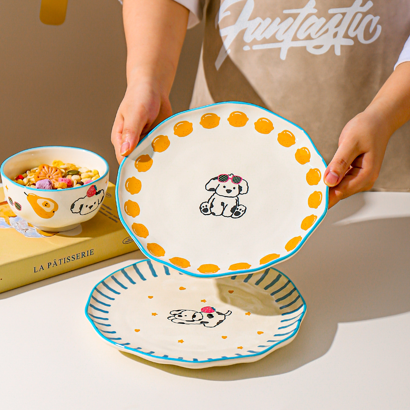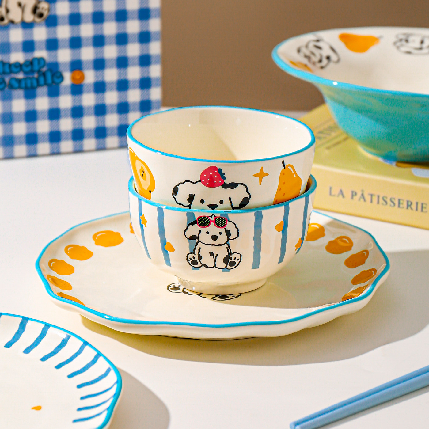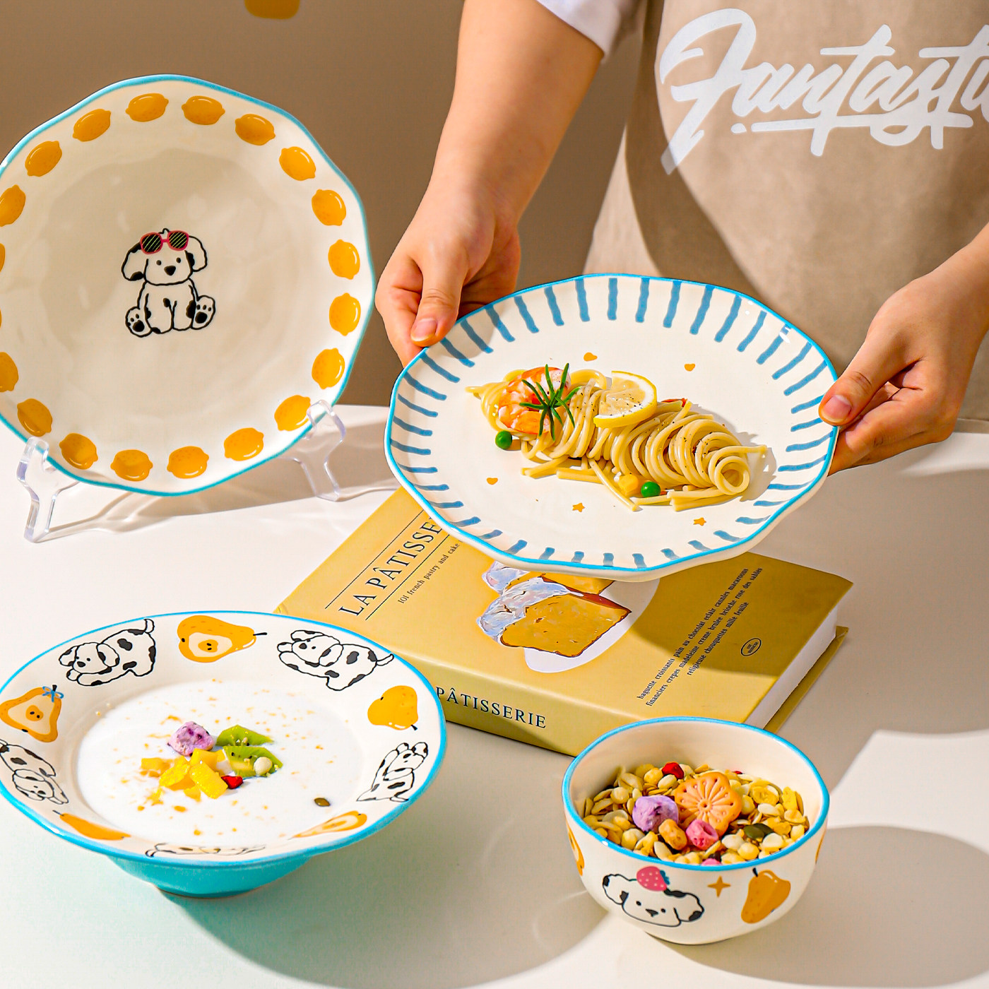 奶油风陶瓷碗家用卡通菜盘子可爱米饭碗汤碗釉下彩儿童餐具耐高温