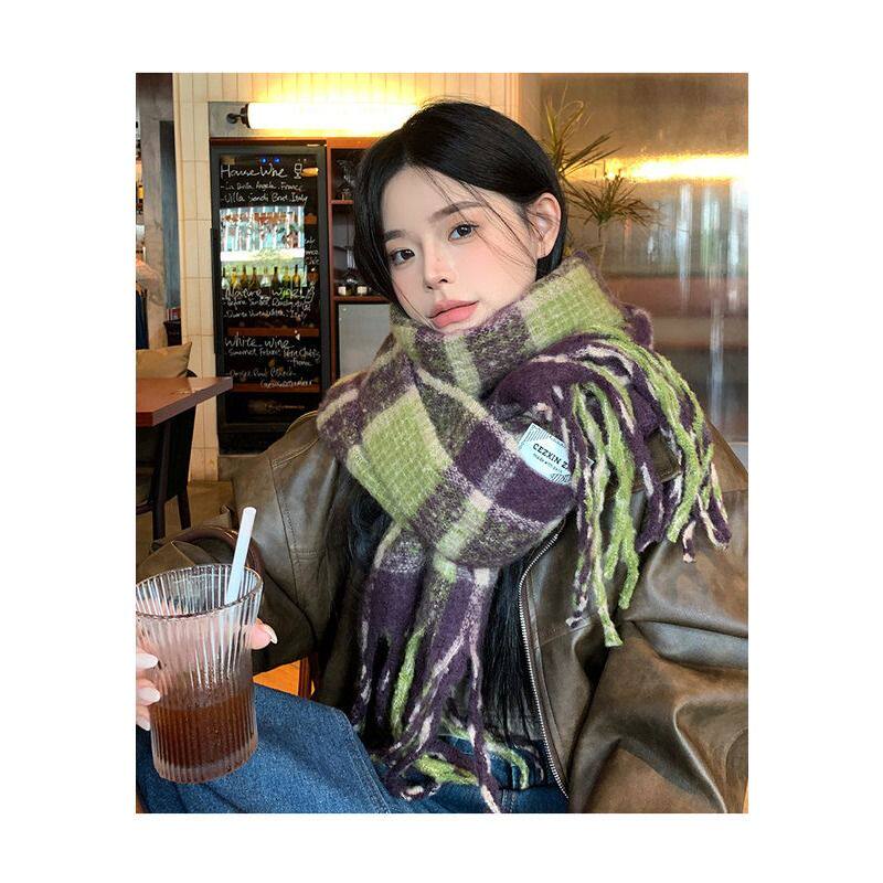 塌雪铃兰/格纹马海毛加长加厚外搭围脖保暖情侣流苏围巾潮粉色