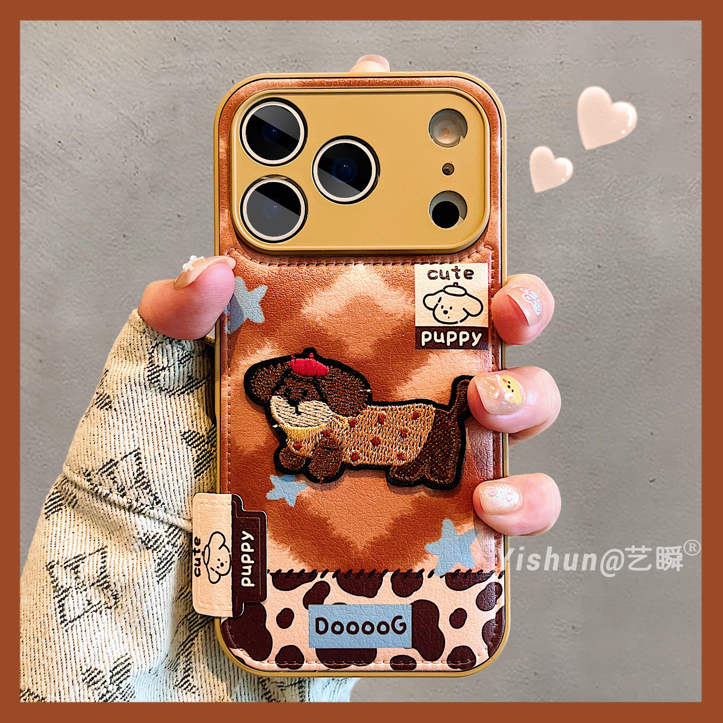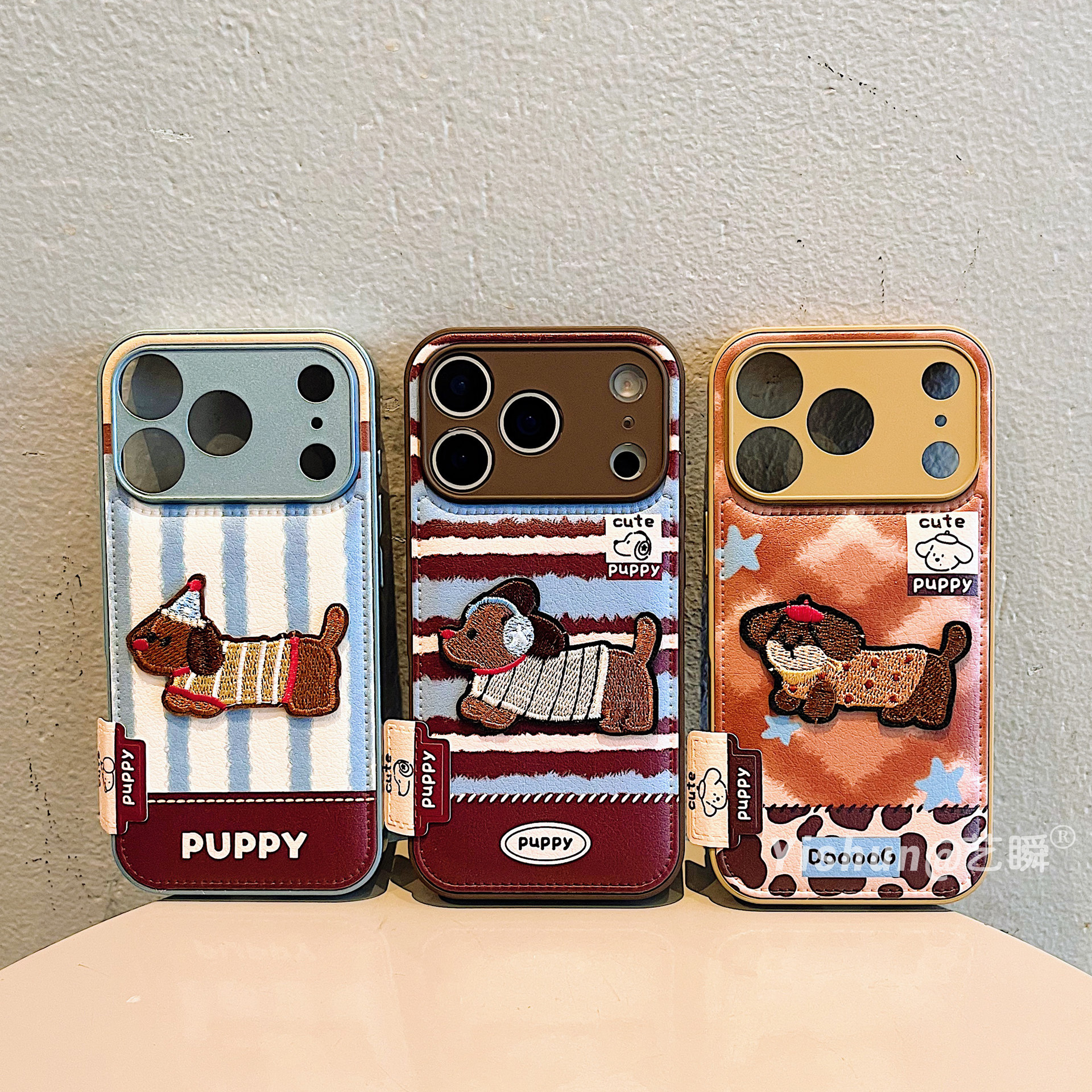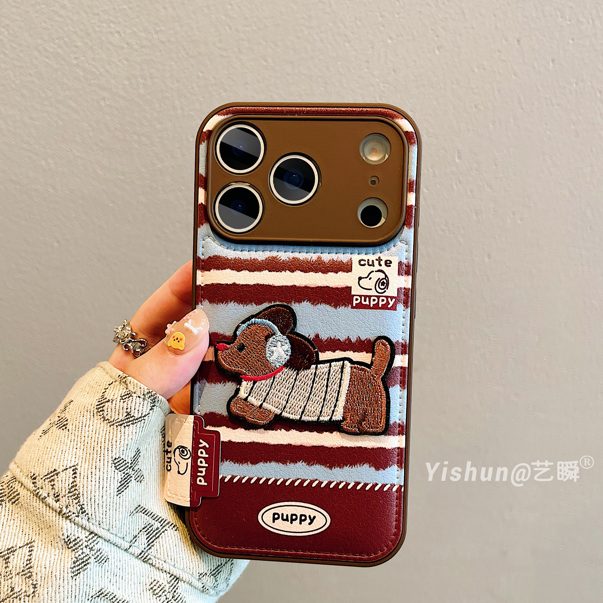 秋冬新款红棕蓝白横纹耳机腊肠狗适用iPhone17ProMax手机壳苹果16pro皮质鼓包13全包镜头15pro可爱14女保护套