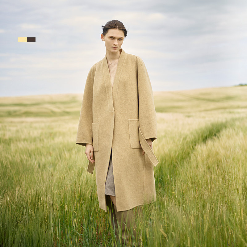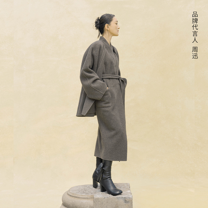 RUISHI芮时重磅驼绒桑蚕丝羊毛慵懒两穿领灰色毛呢大衣秋冬外套女