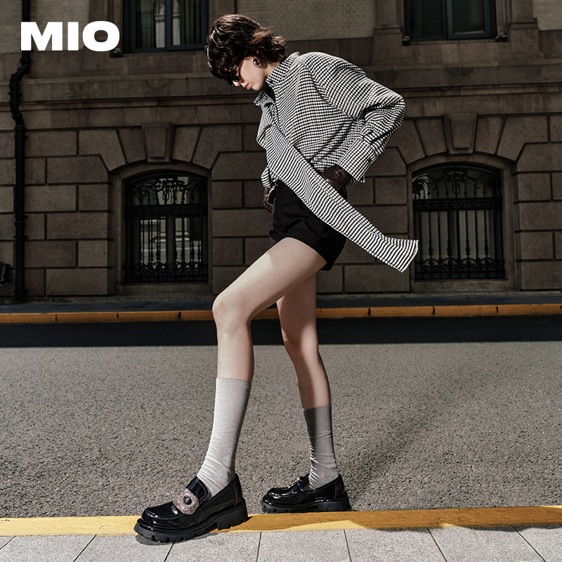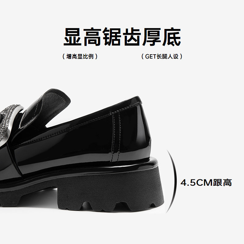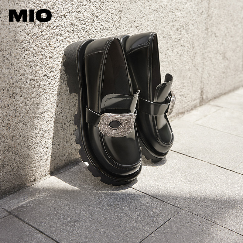 MIO米奥秋季复古圆头粗跟乐福鞋星光钻饰厚底学院单鞋女鞋
