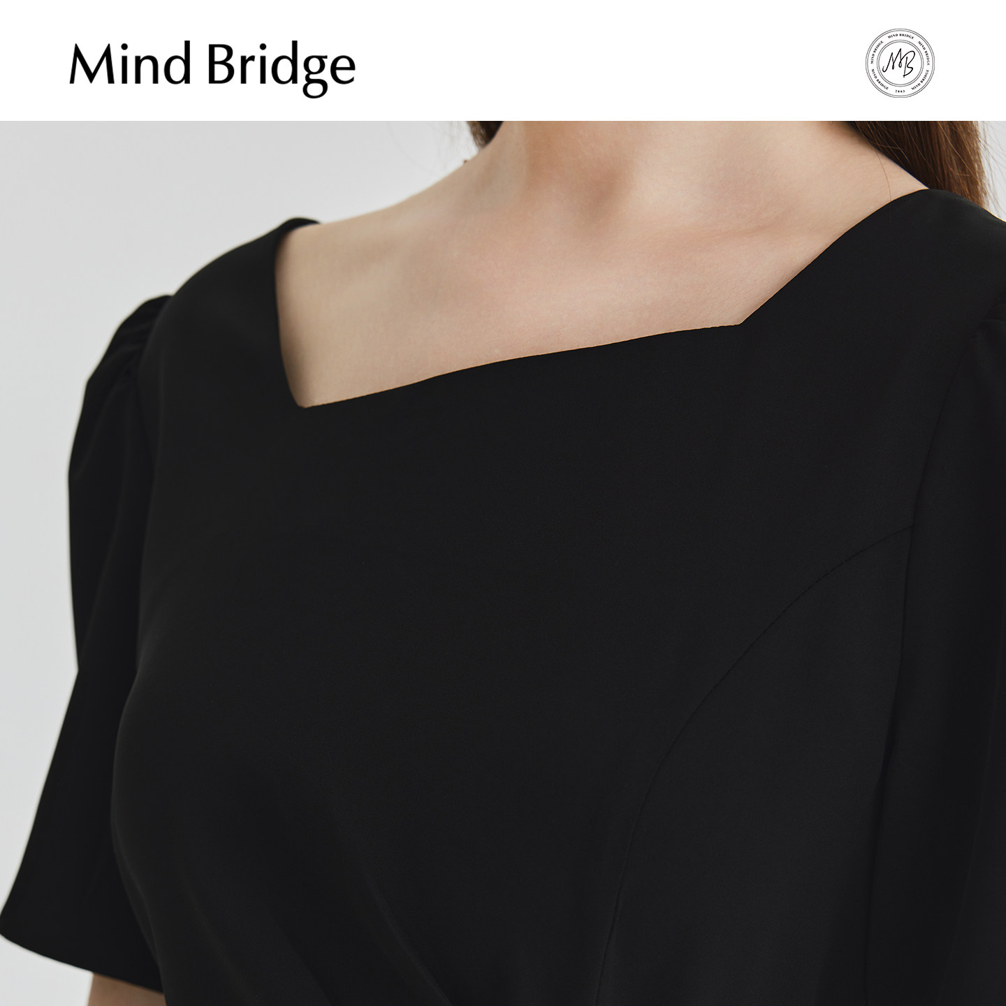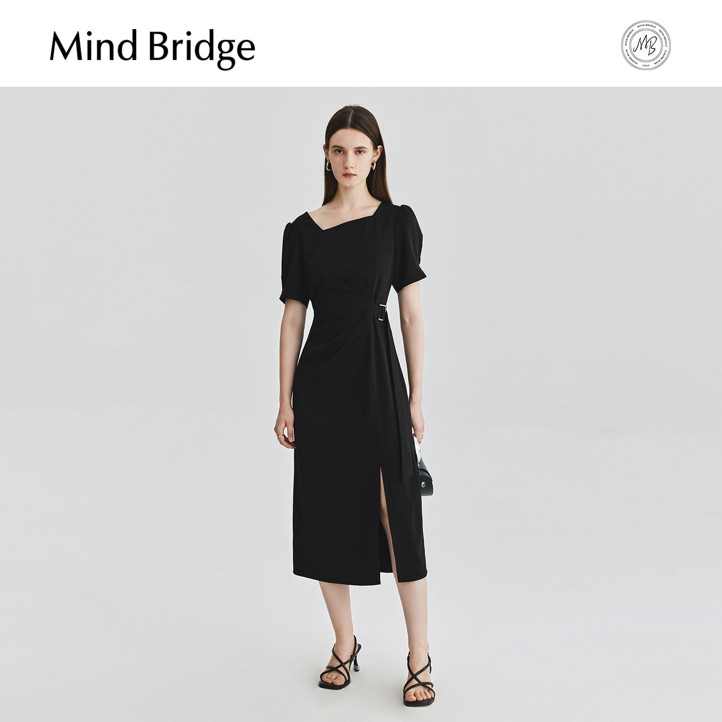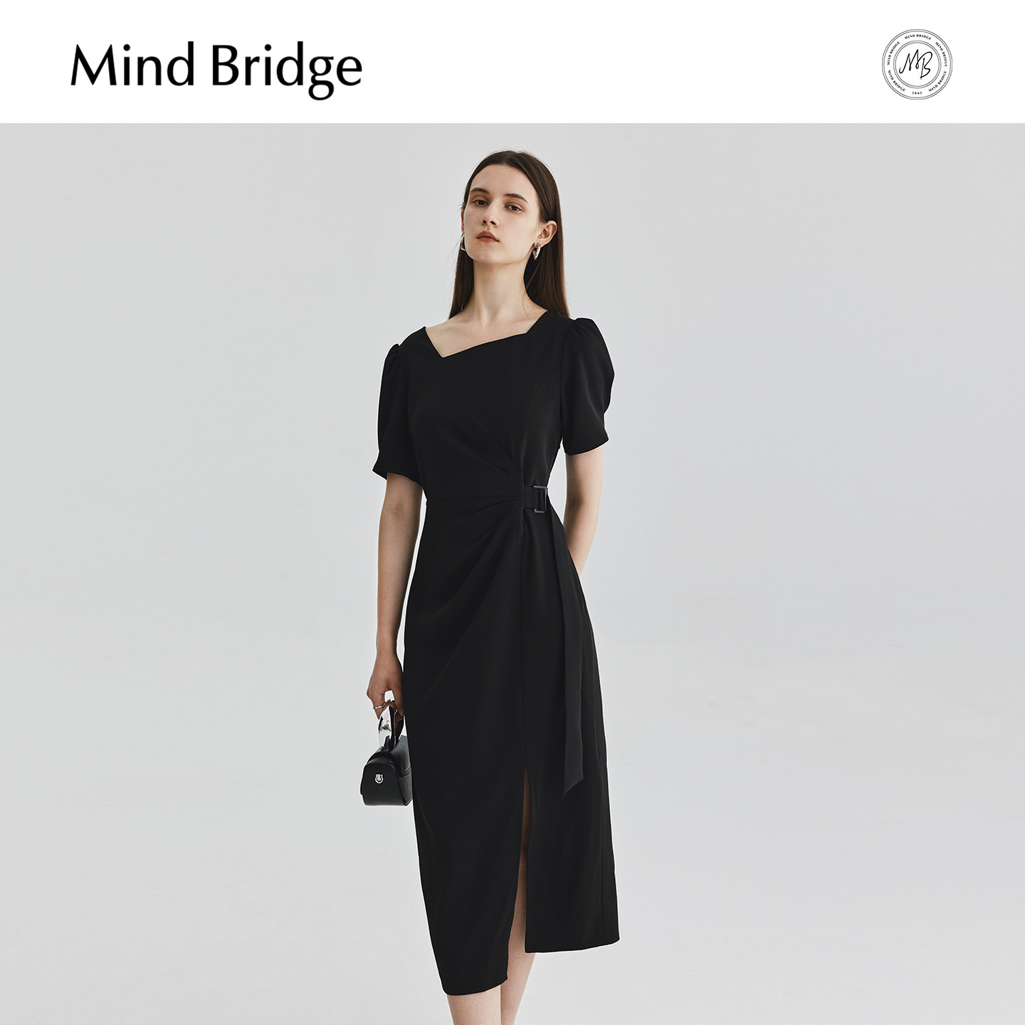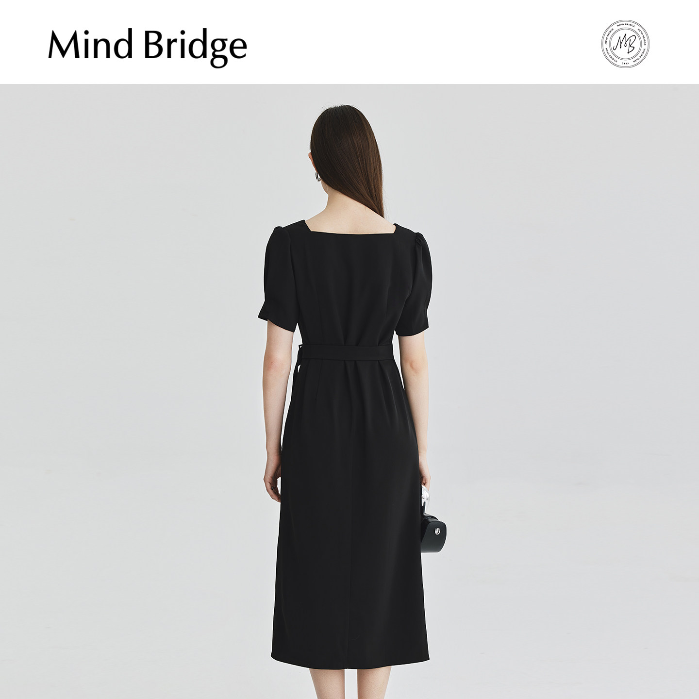 Mind Bridge女士方领连衣裙设计感中长裙夏季收腰裙子开衩小黑裙