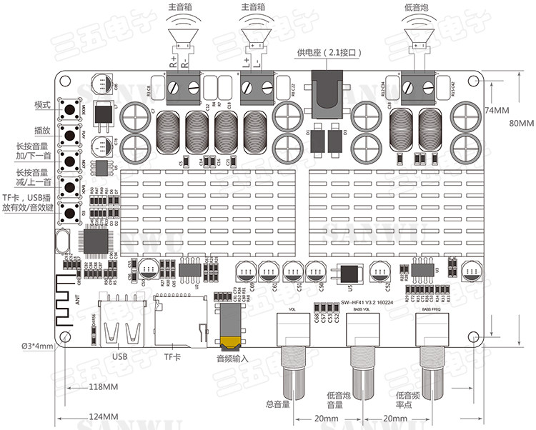 蓝牙功放板TPA3116蓝牙接收USB TF卡解码200W 2.1声道数字功放板