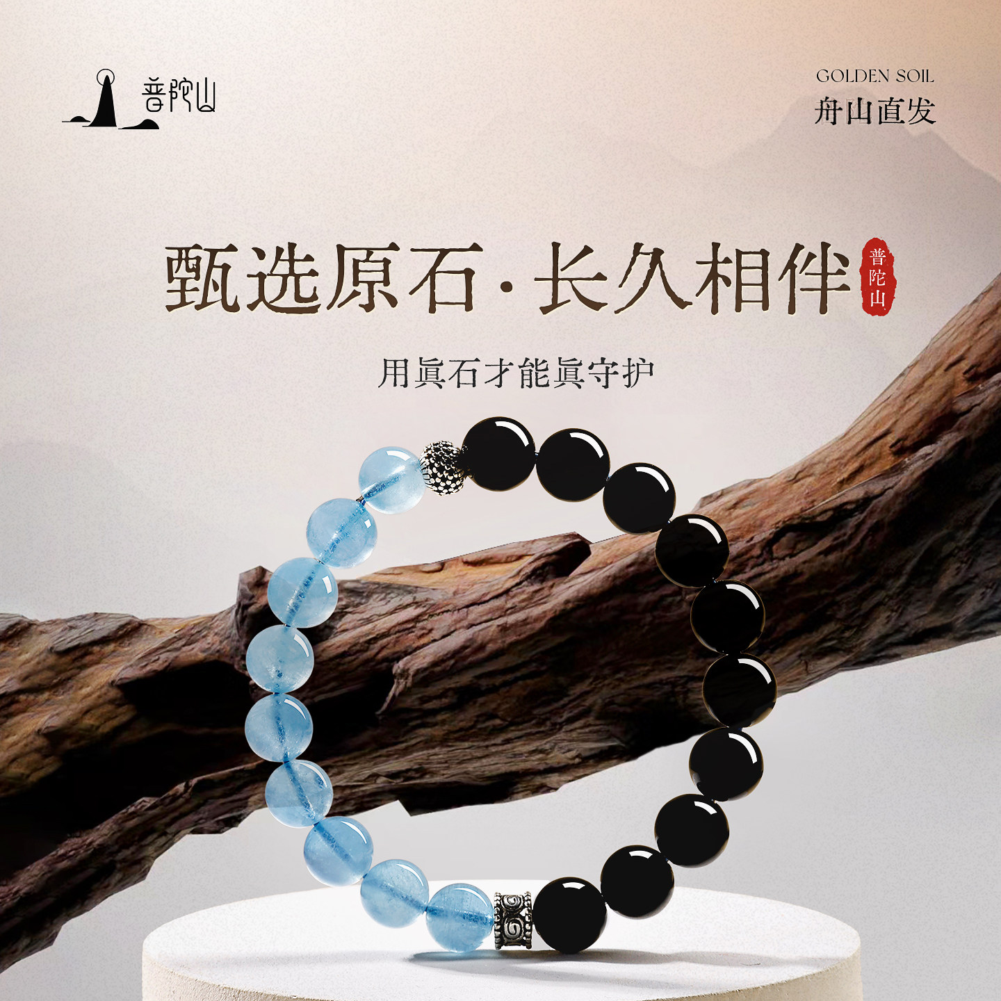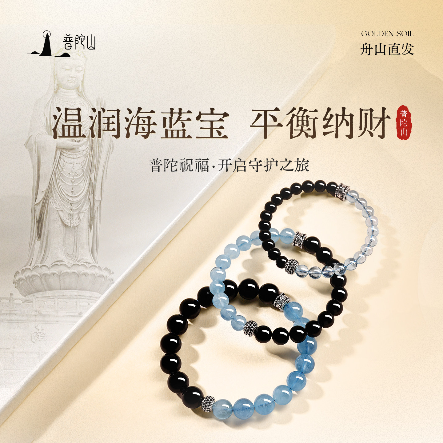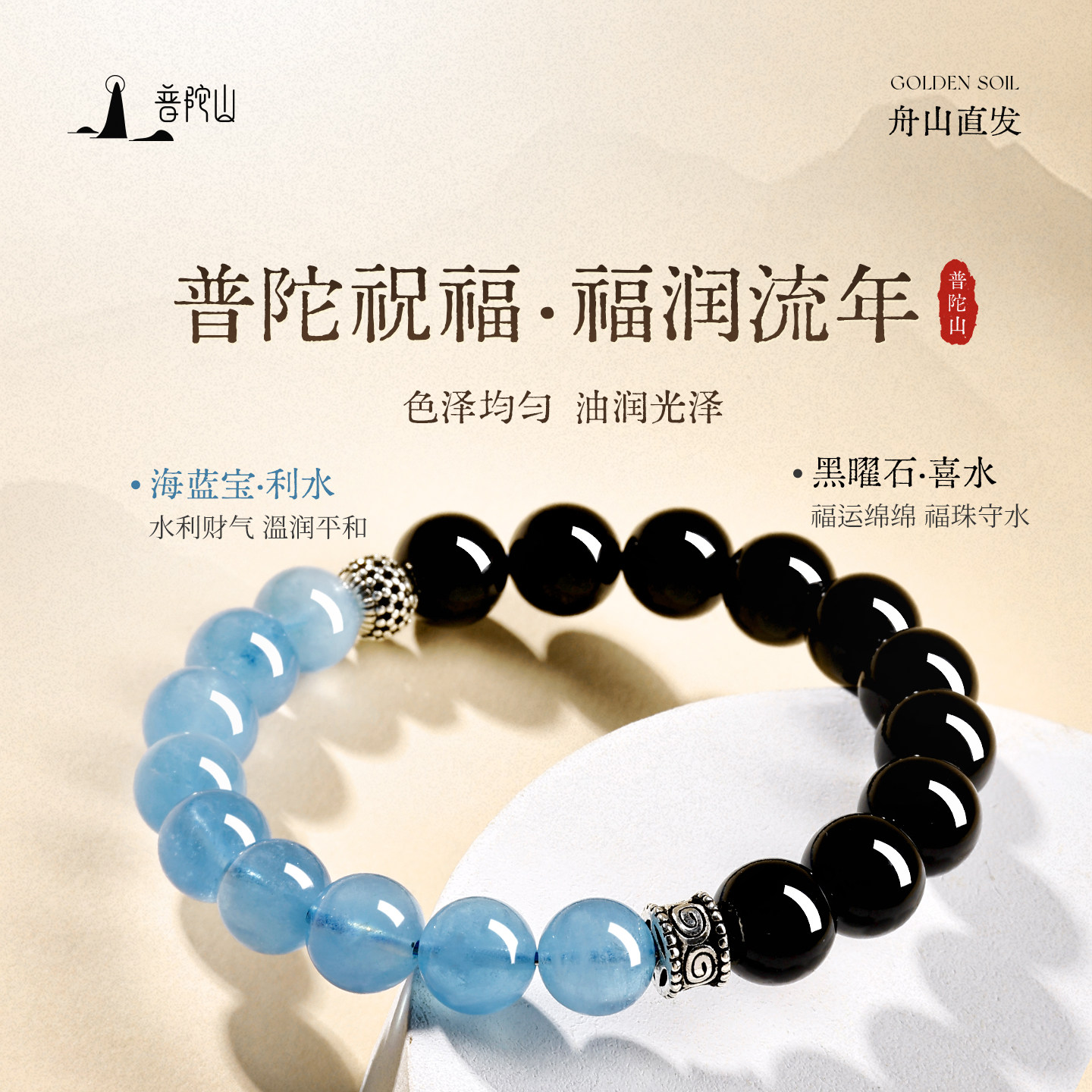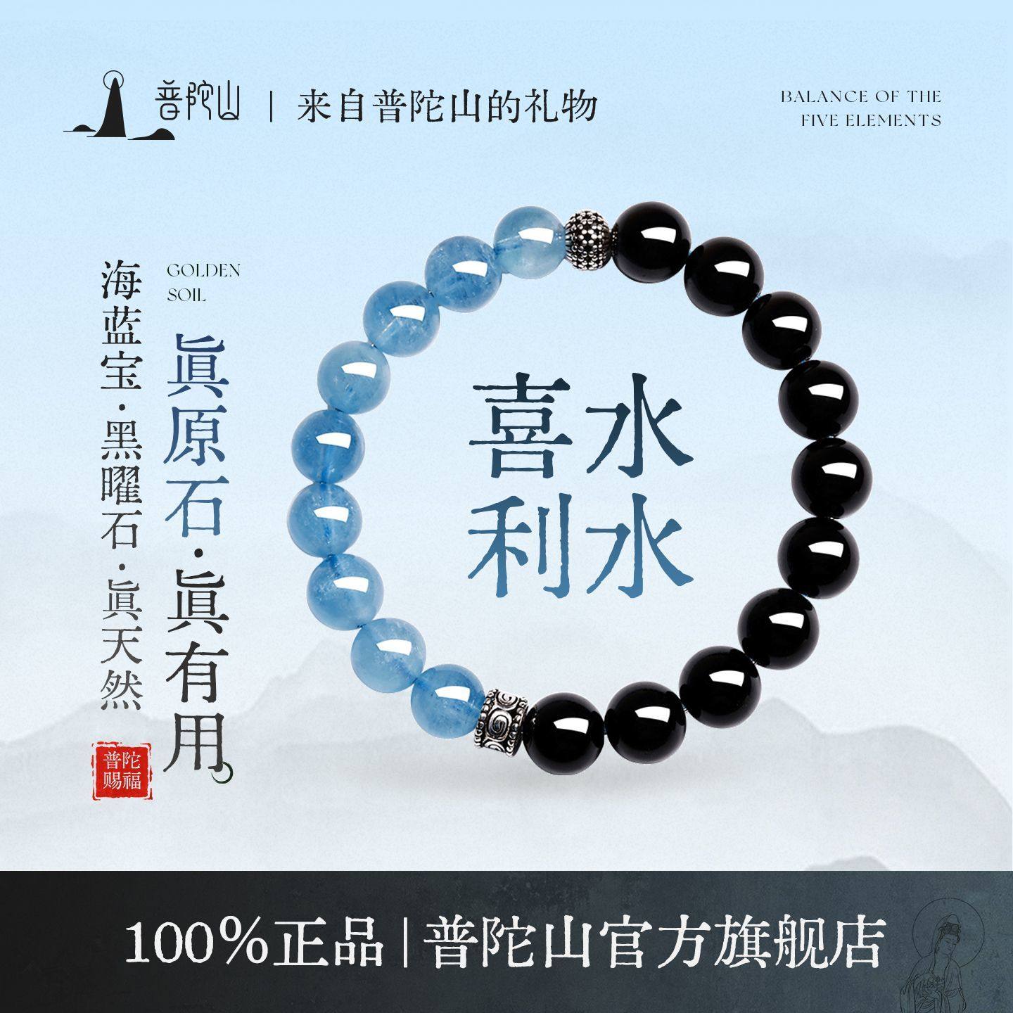 普陀山黑曜石海蓝宝手串女款官方天然水晶手链送女朋友的礼物