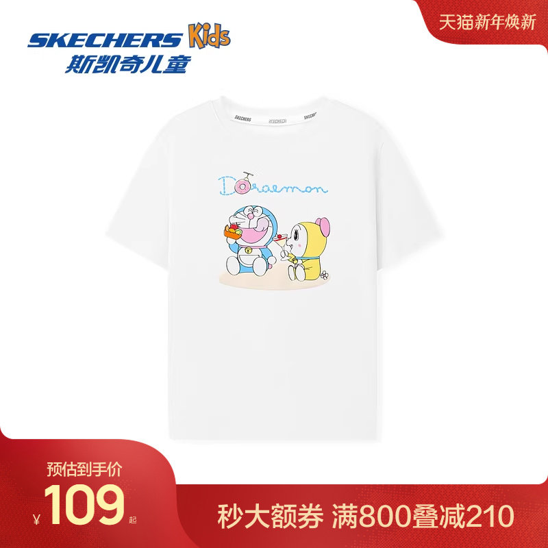 【哆啦A梦】Skechers斯凯奇女童夏季卡通印花柔软舒适针织短袖