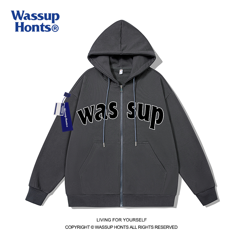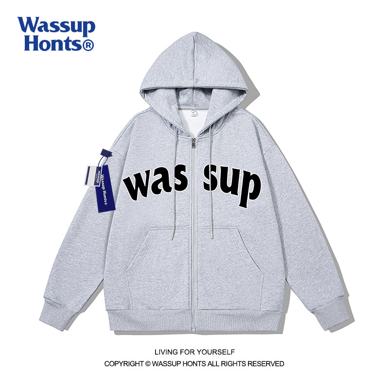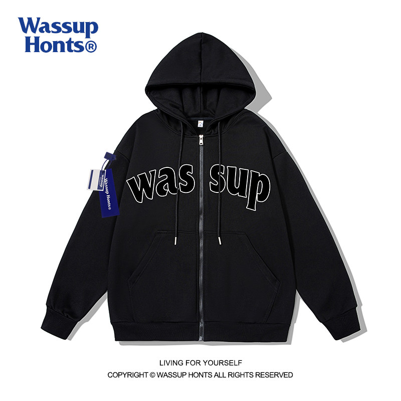 WASSUP拉链外套开衫字母印花潮牌秋冬加绒情侣运动休闲连帽卫衣男