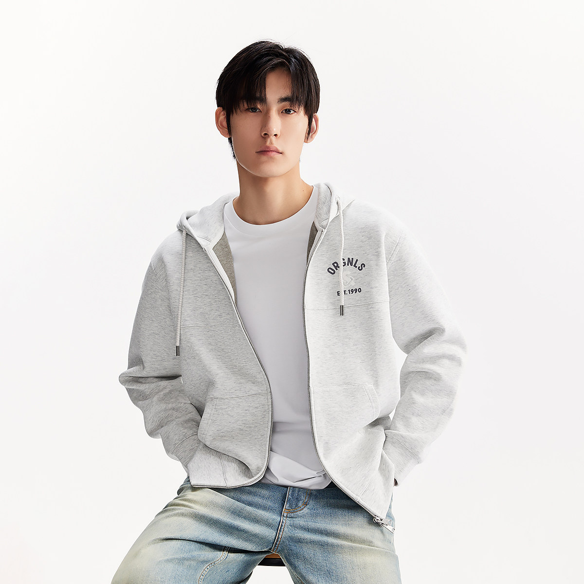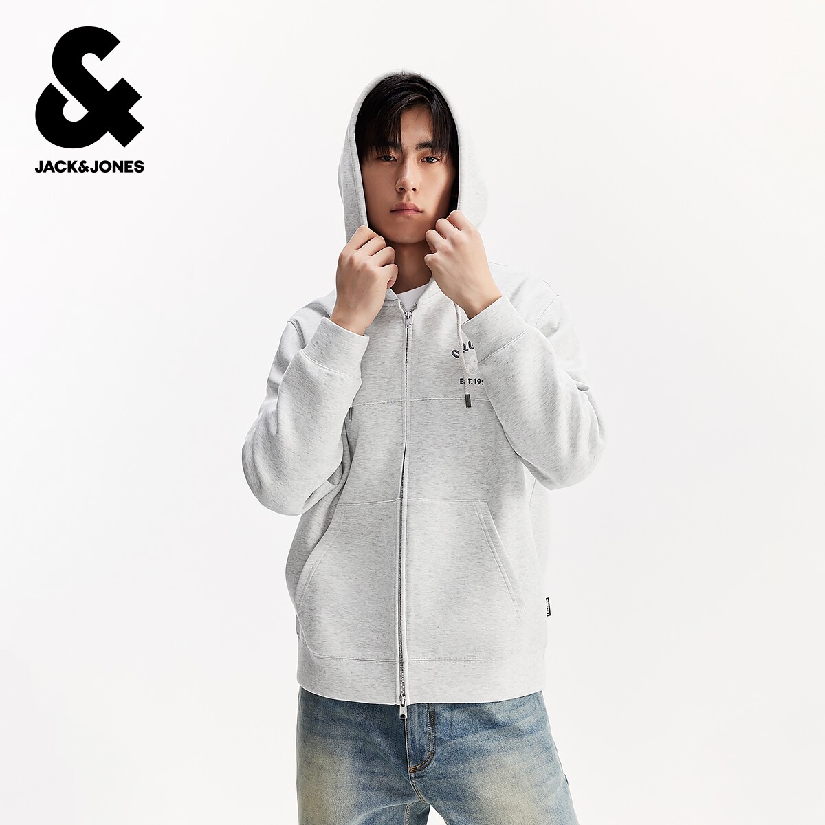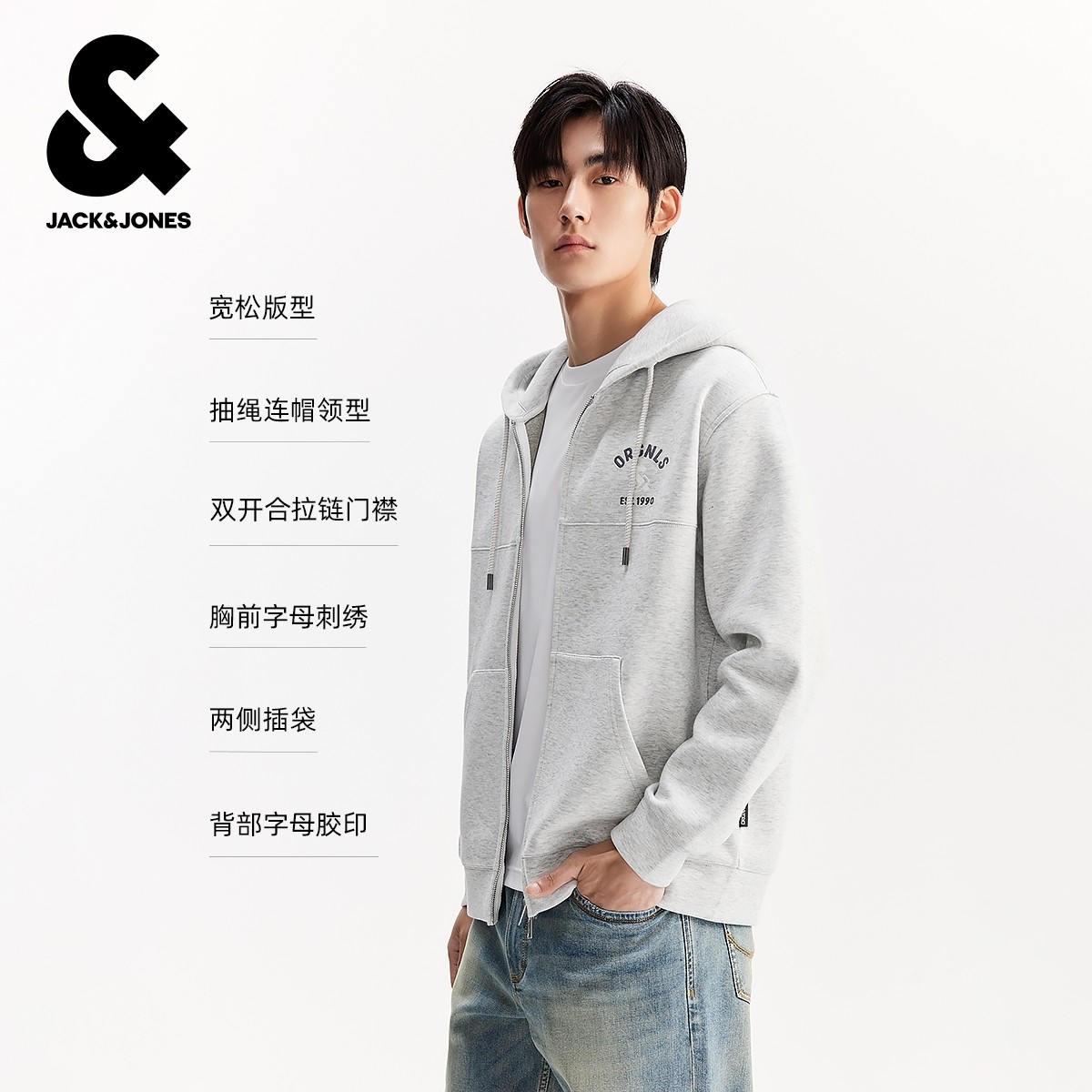 杰克琼斯男装冬季新款字母刺绣双开合拉链休闲宽松抽绳连帽卫衣