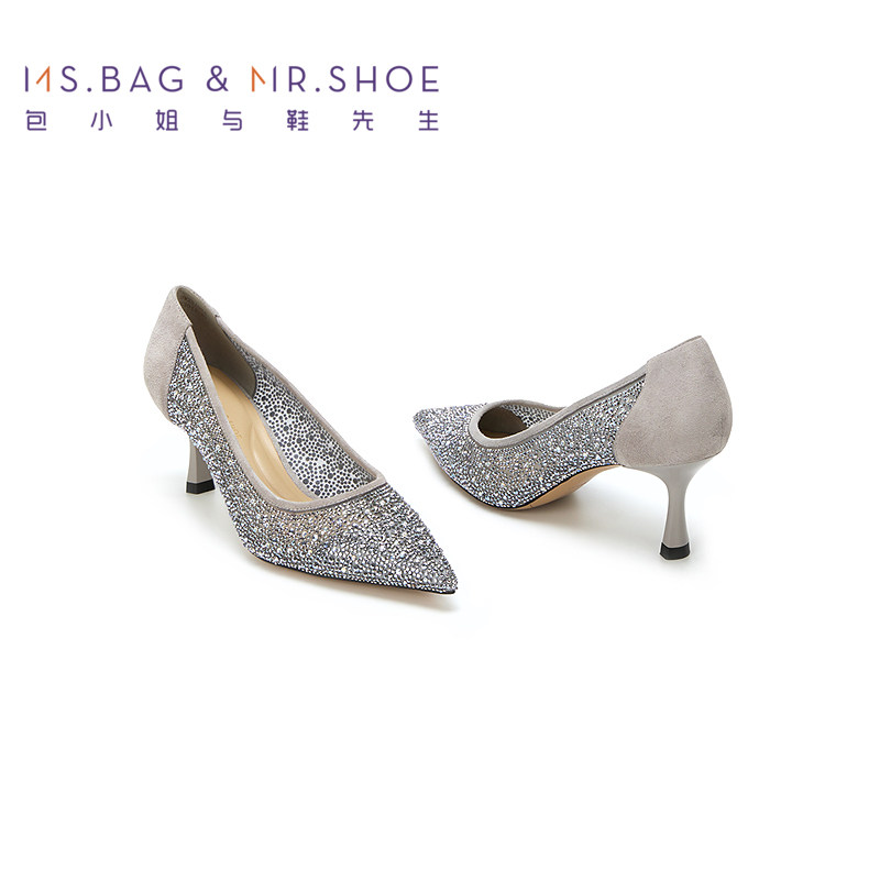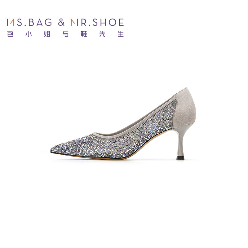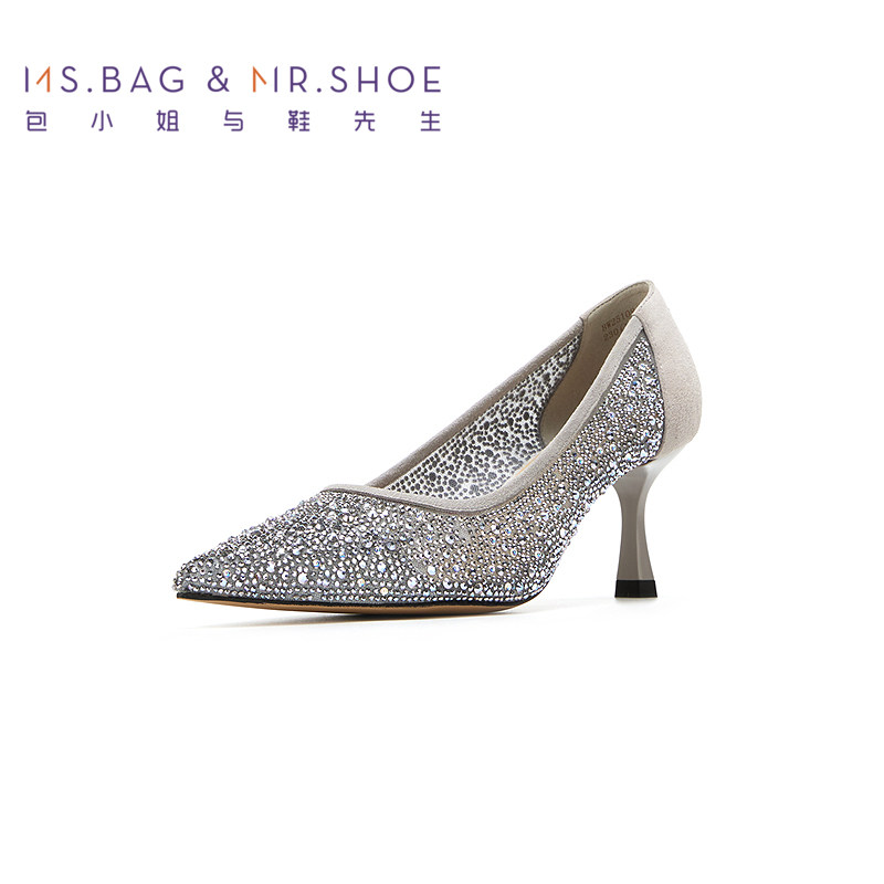 包小姐与鞋先生2025年春季新品灰色织物烫钻网纱浅口单鞋女251084
