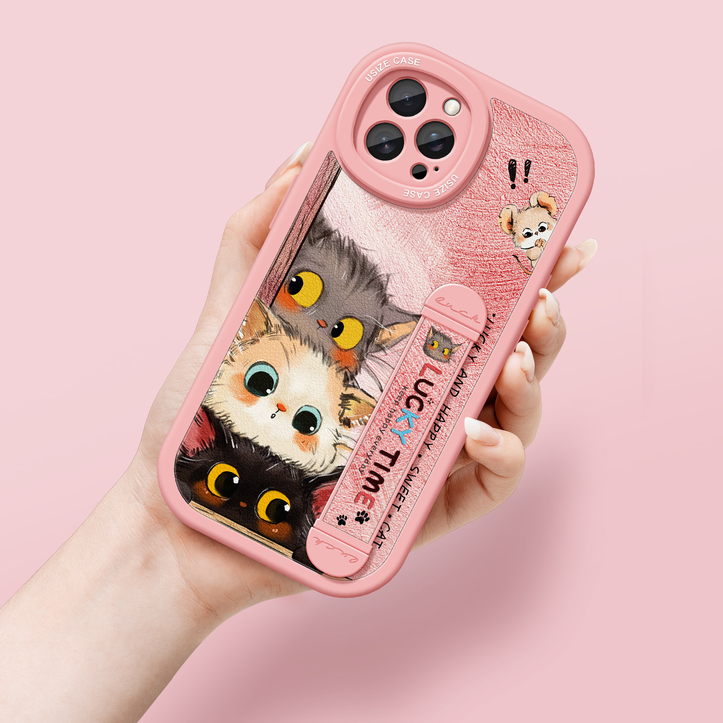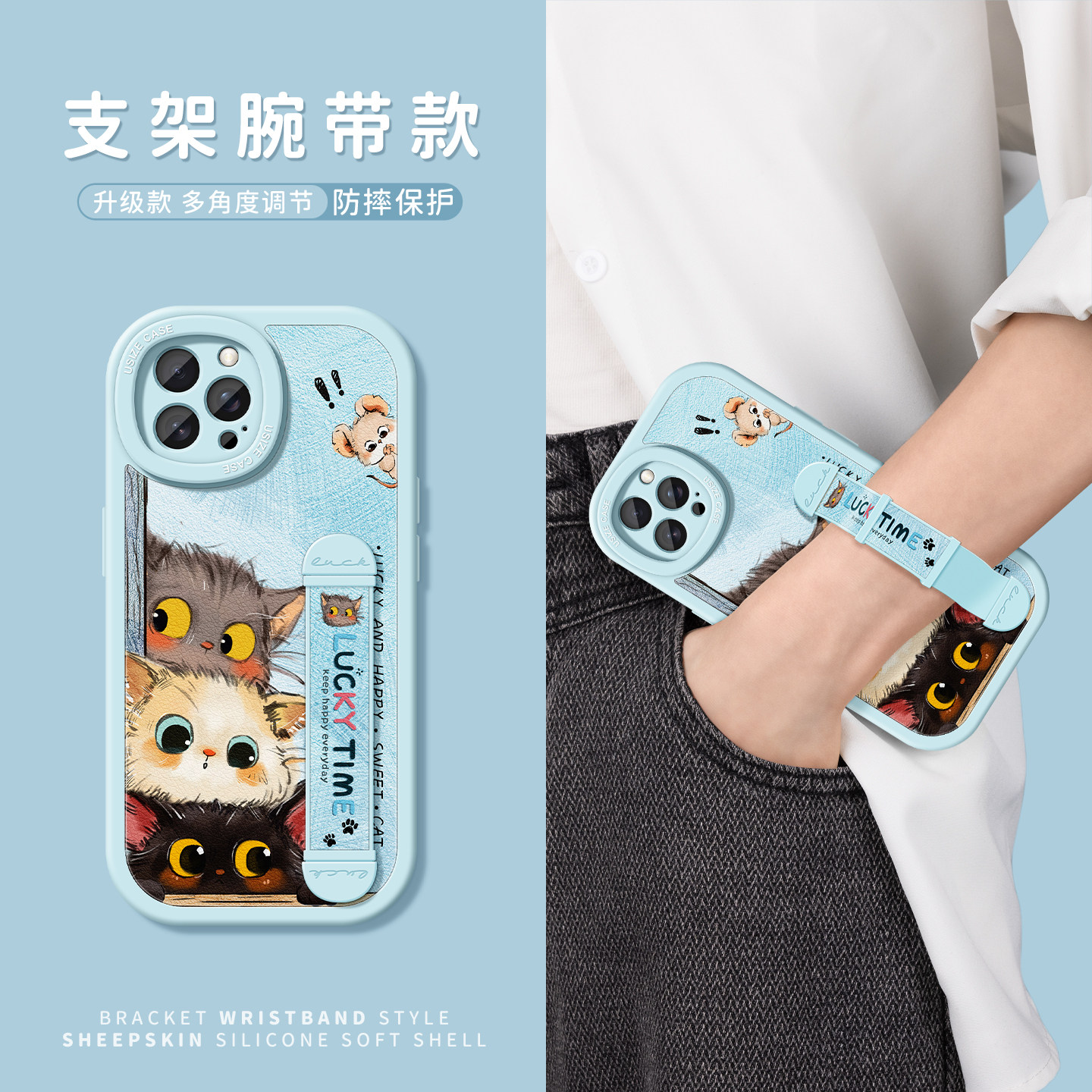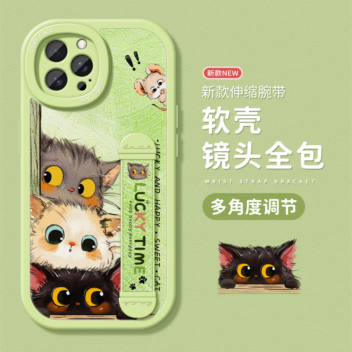 适用苹果17手机壳13pro新款女iPhone16proMAX全包15防摔14pro腕带xs支架7plus可调节17air高级12pro好奇小猫8