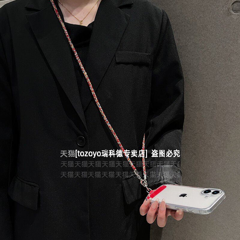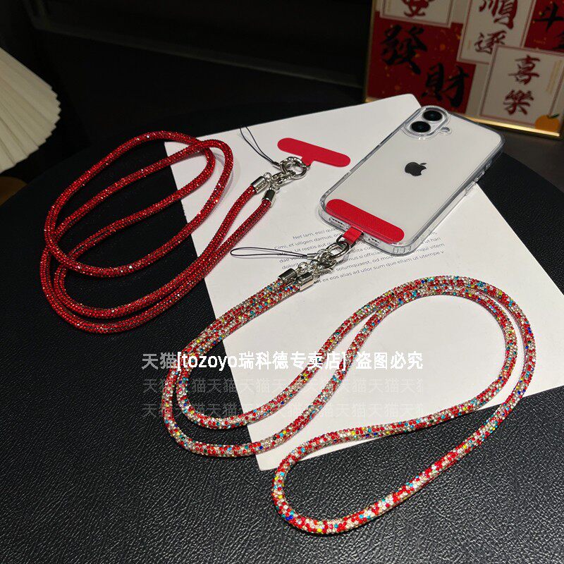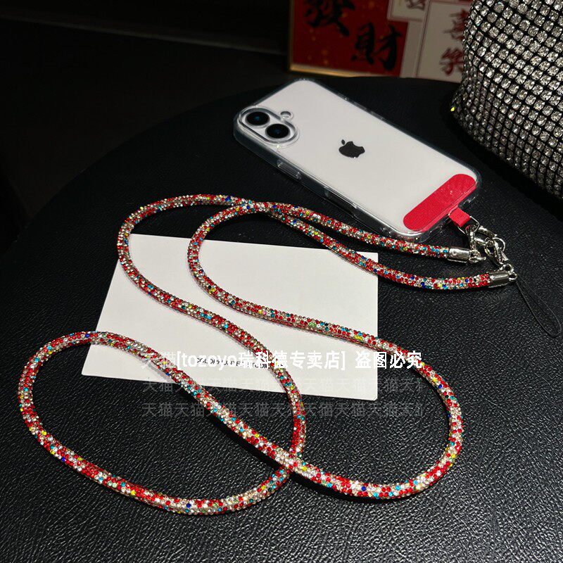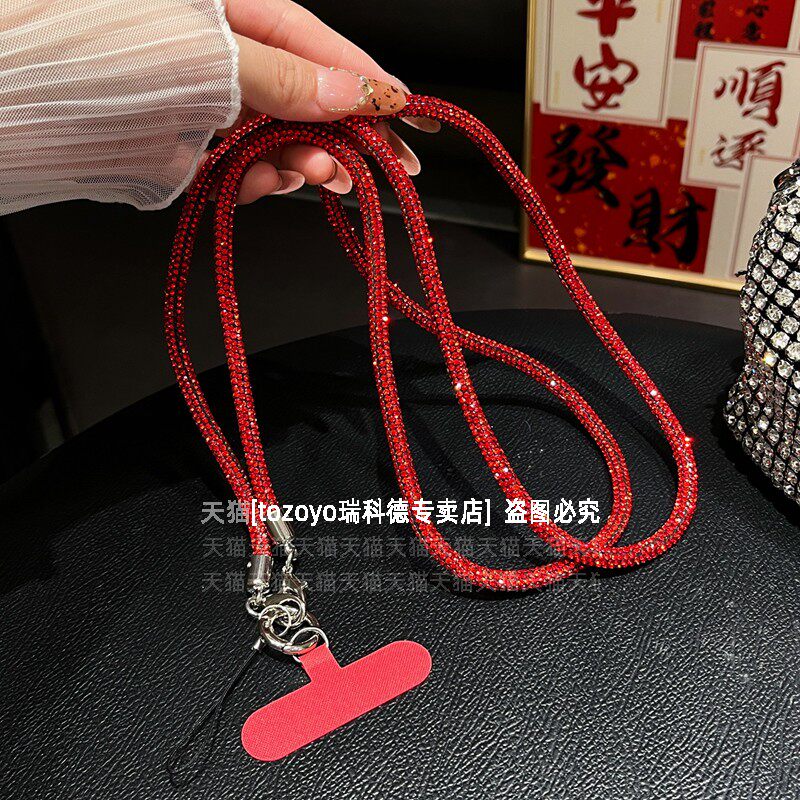 酒红色斜挎手机链挂绳闪亮水钻挂链洋气背带链条新款挂件本命年时尚闪钻链子包包带钻挂饰喜庆高端蛇年防丢壳