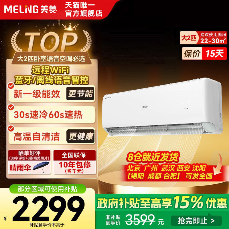 补15%美菱冰激凌大2匹一级能效挂机变频空调冷暖语音智控家用空调