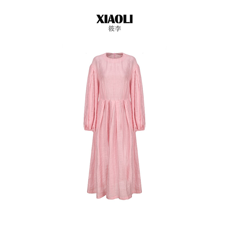 【XIAOLI筱李】秀场同款粉色亚麻灯笼袖长款连衣裙