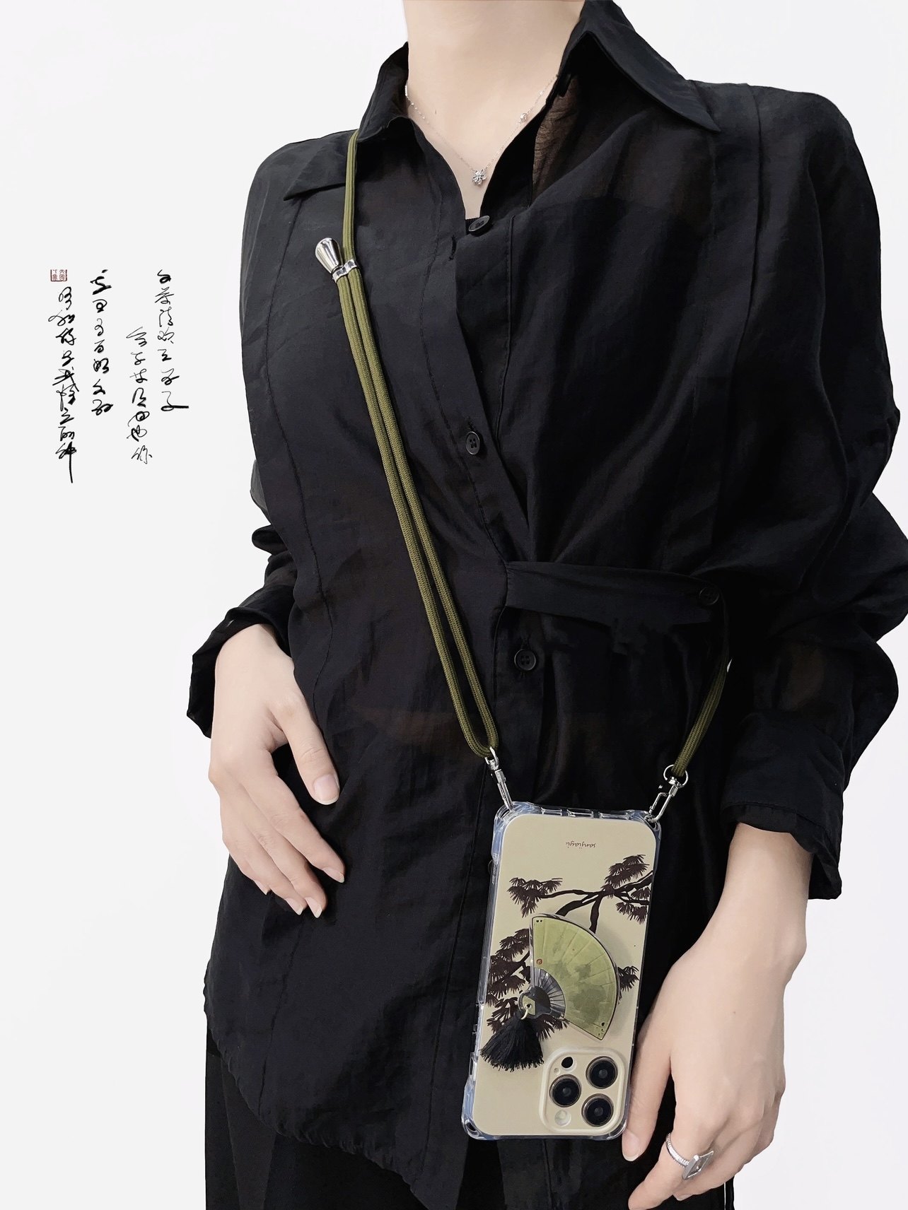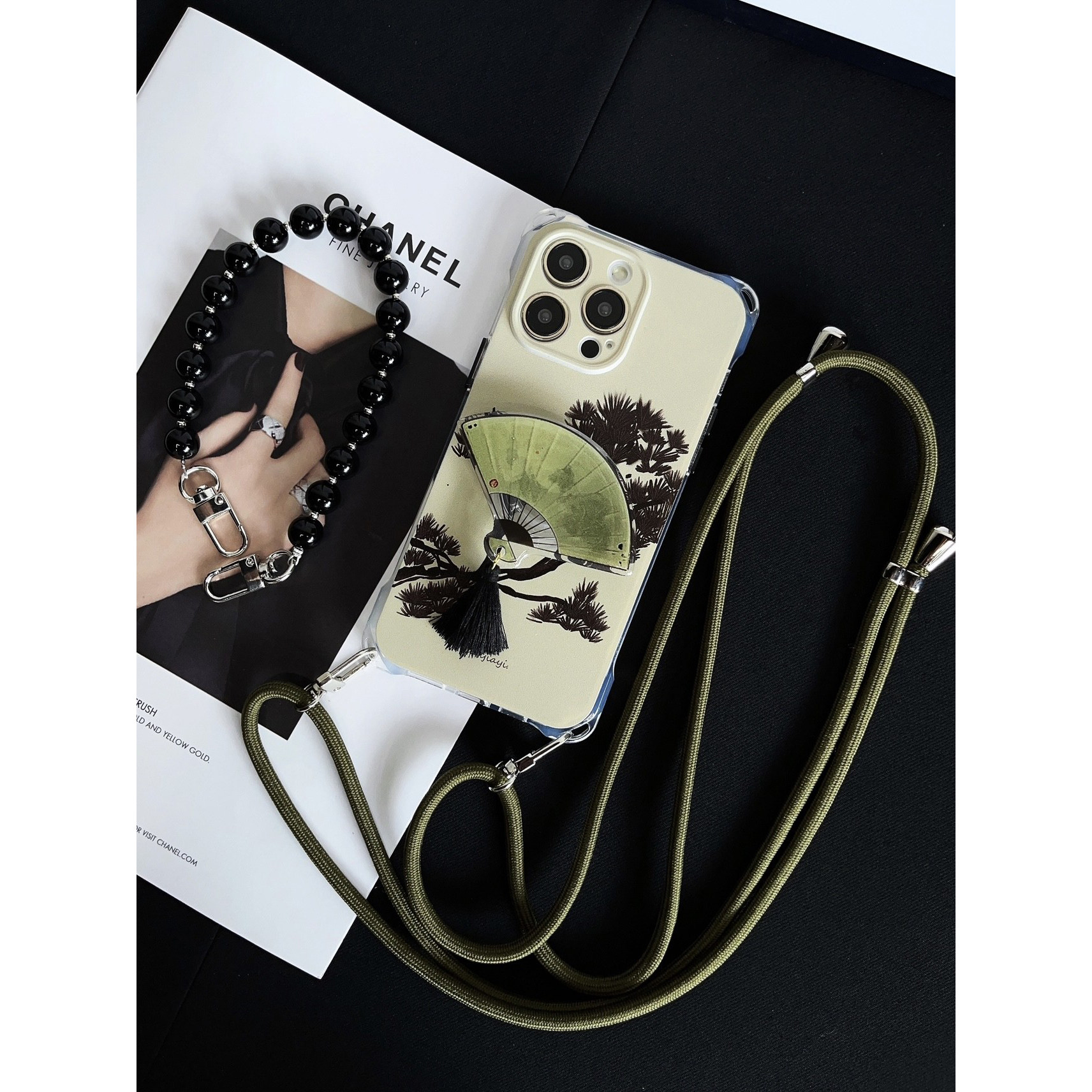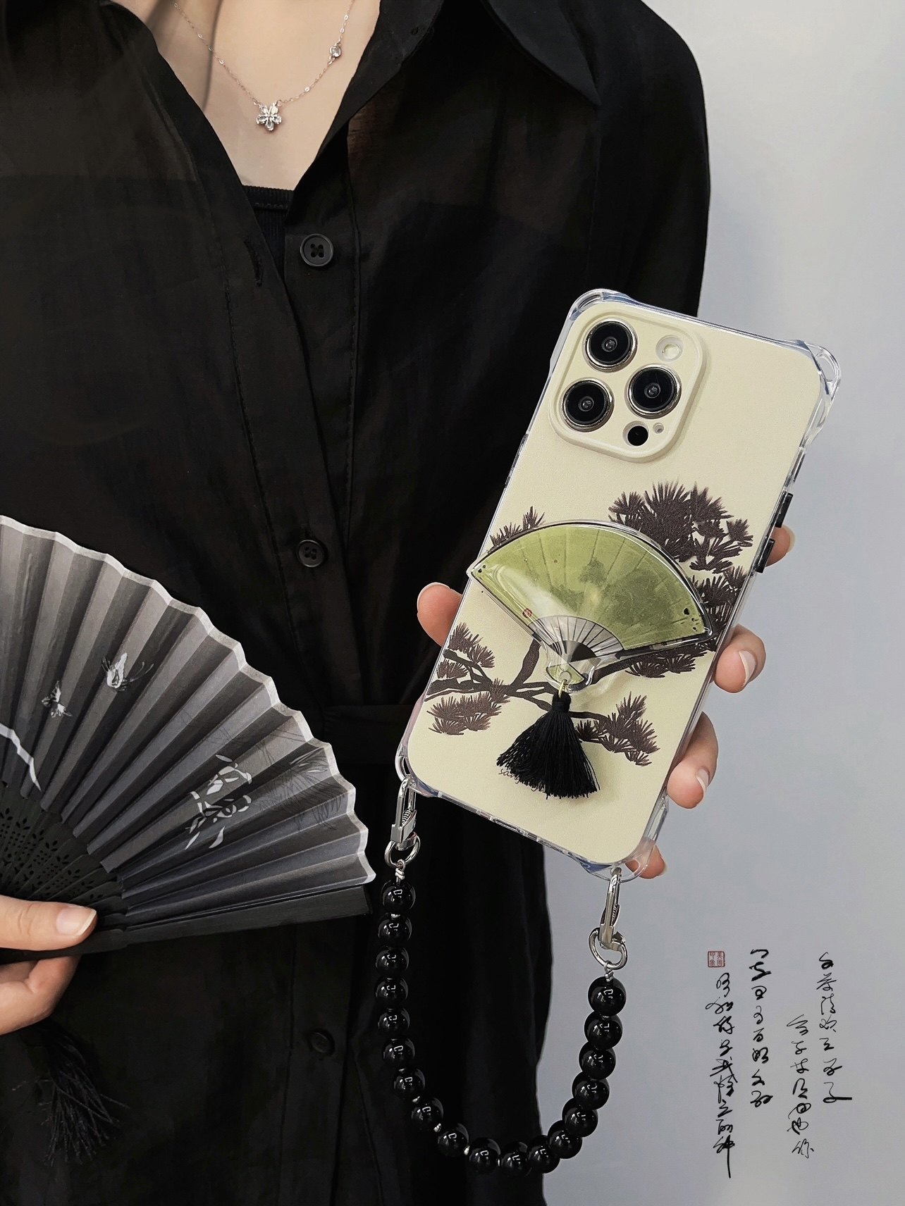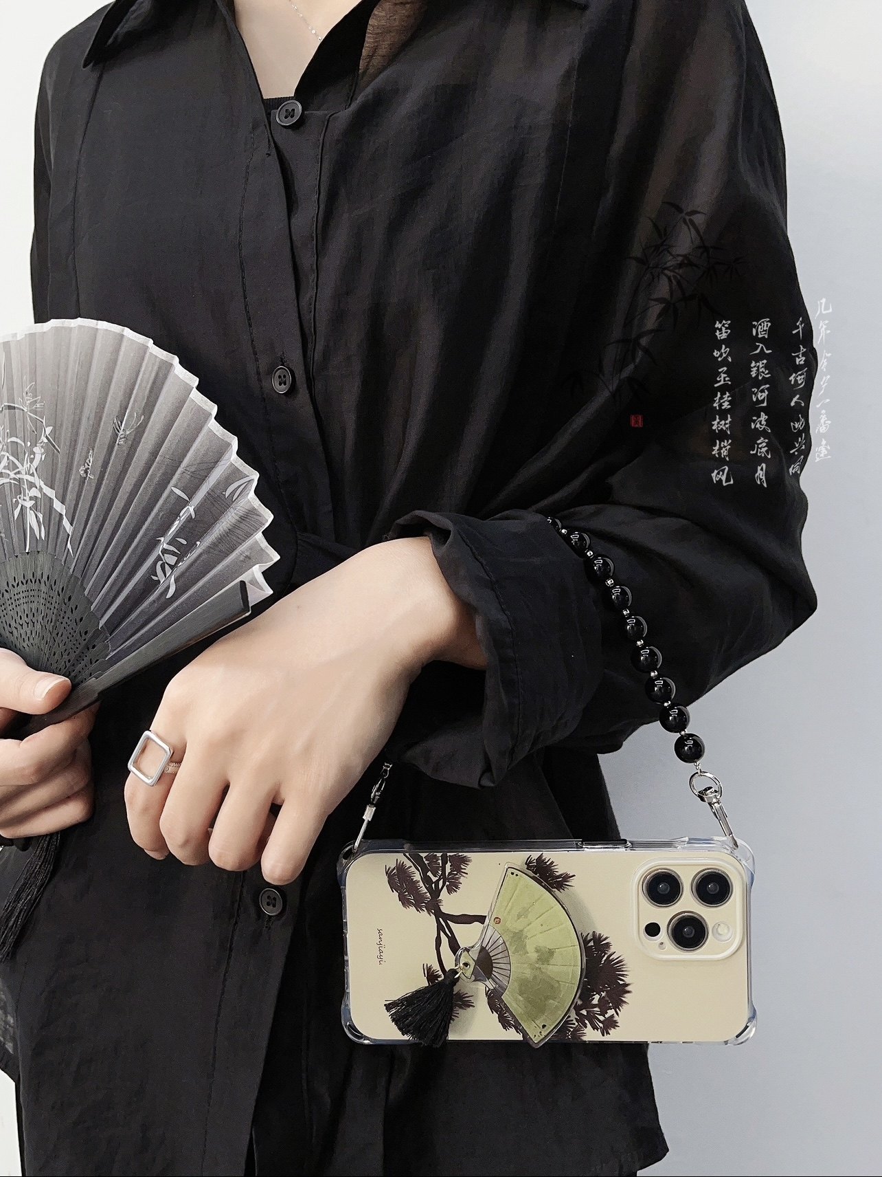 新中式古风杏松树挂绳手机壳15Promax折扇支架斜挎11防摔13适用华为小米苹果iPhone14plus新款mate60小众12女