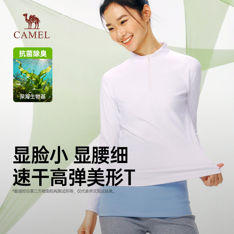 骆驼速干衣女长袖T恤户外登山跑步运动瑜伽黑色半拉链立领上衣女
