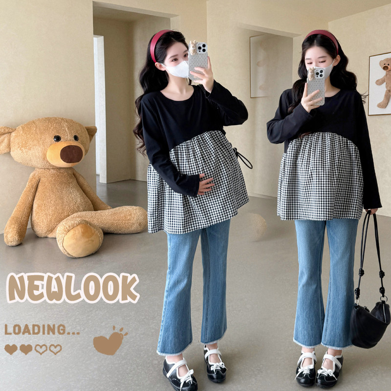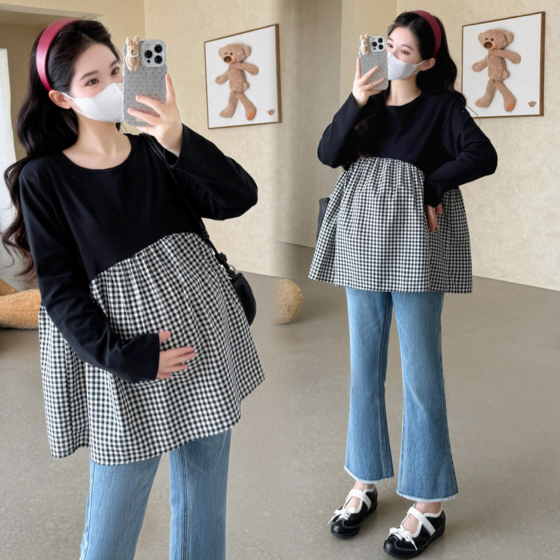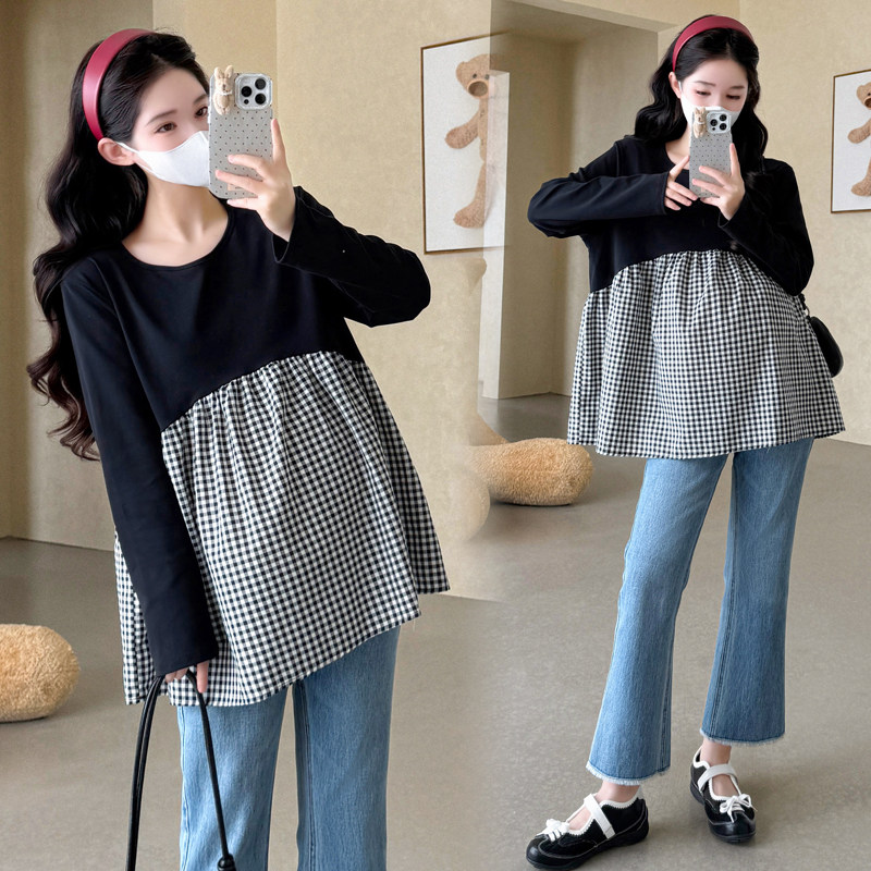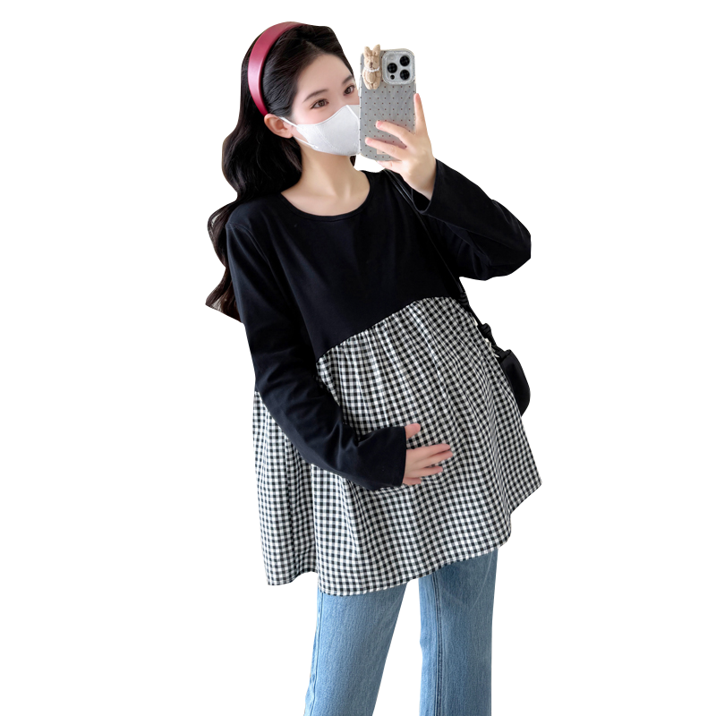 婧麒孕妇装2025新款春秋款格子拼接长袖T恤女宽松显瘦上衣打底衫