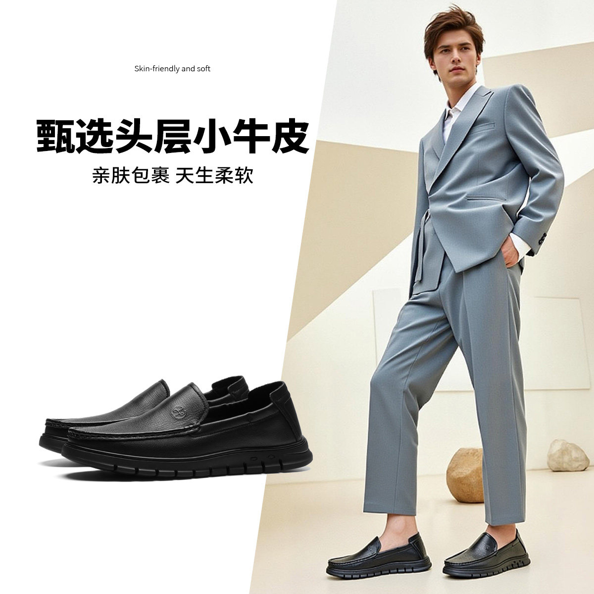 奥康春秋季商务休闲皮鞋男真皮软底乐福鞋舒适一脚蹬套脚爸爸鞋