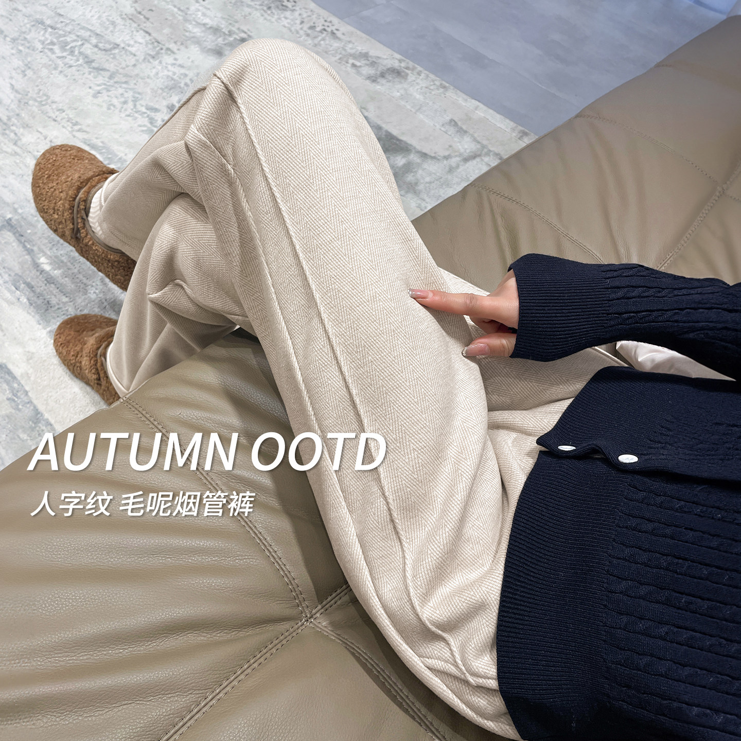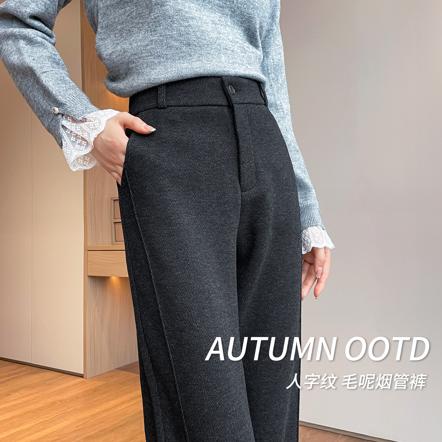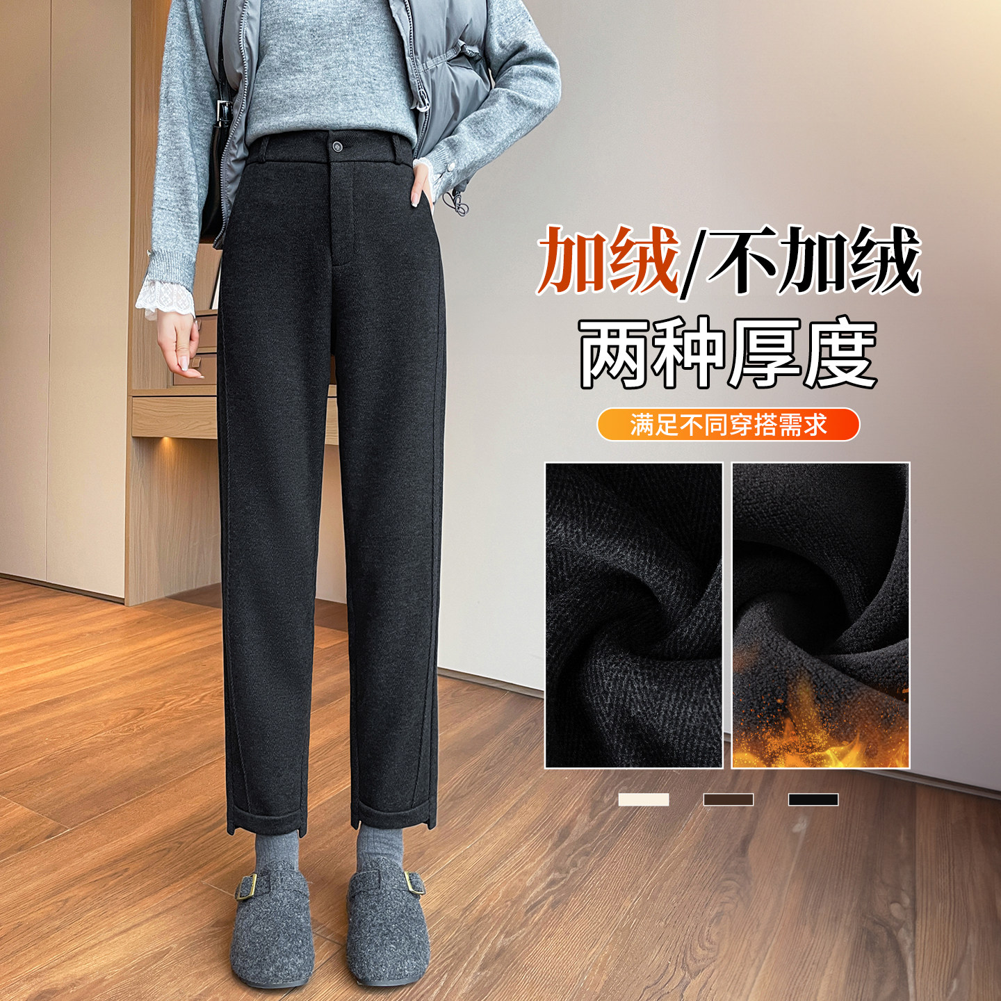 黑色加绒烟管裤女2025新款冬加厚小个子直筒休闲九分毛呢小脚裤子