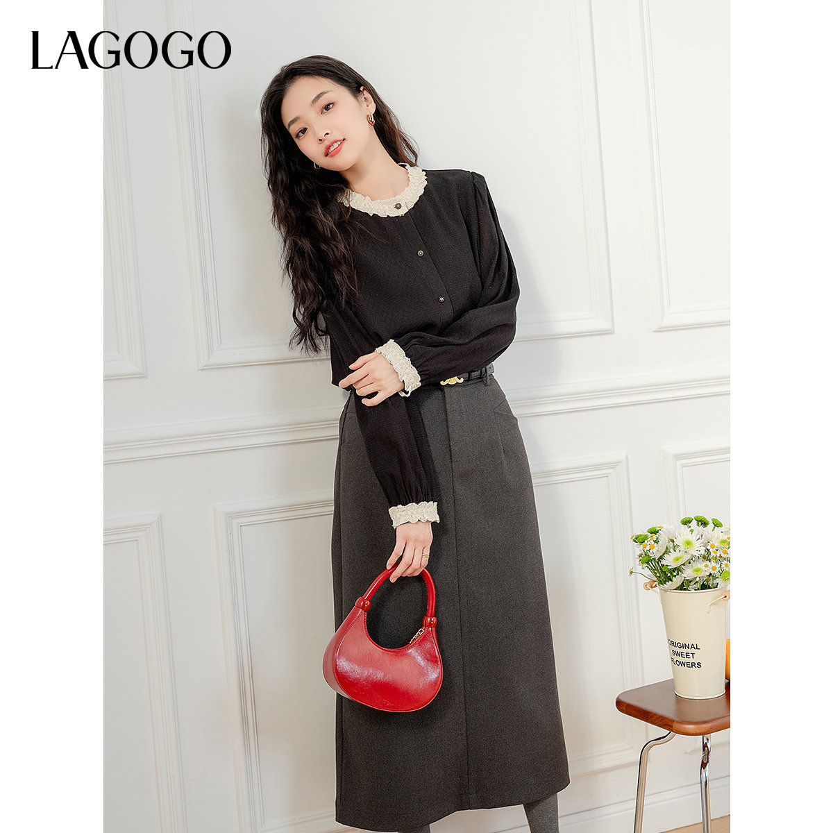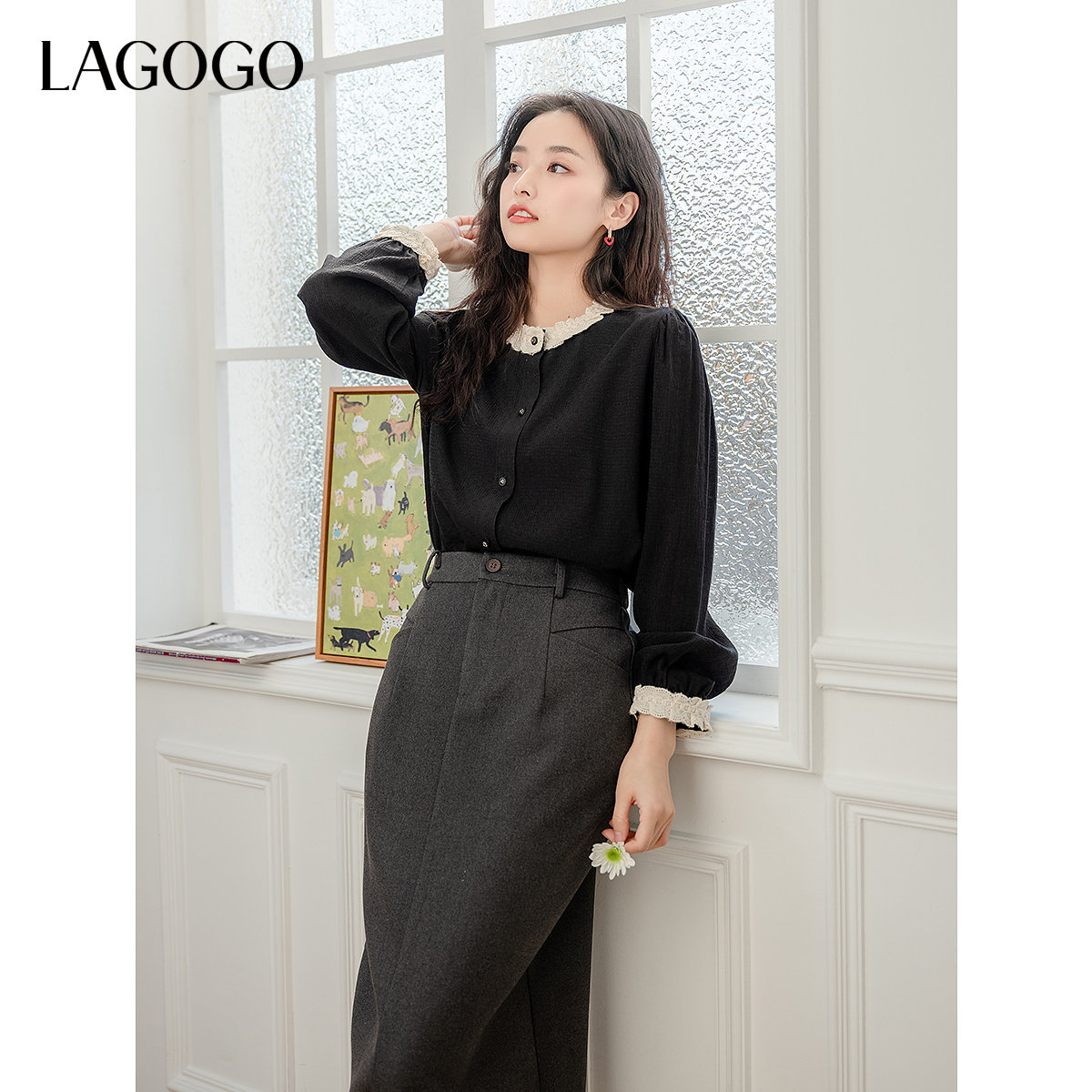 LAGOGO黑色圆领衬衫女拉谷谷2025秋冬新款蕾丝法式优雅气质上衣