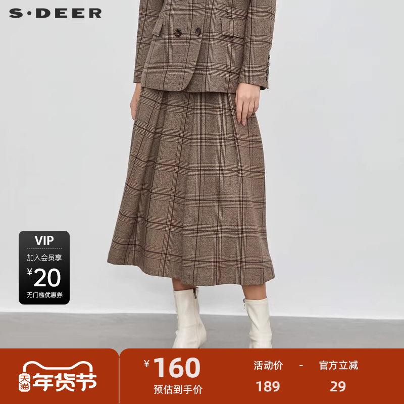 sdeer圣迪奥女装学院风套装格纹百褶毛呢长裙S23461103