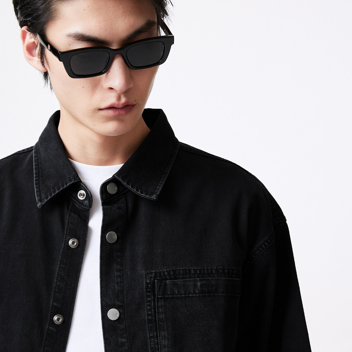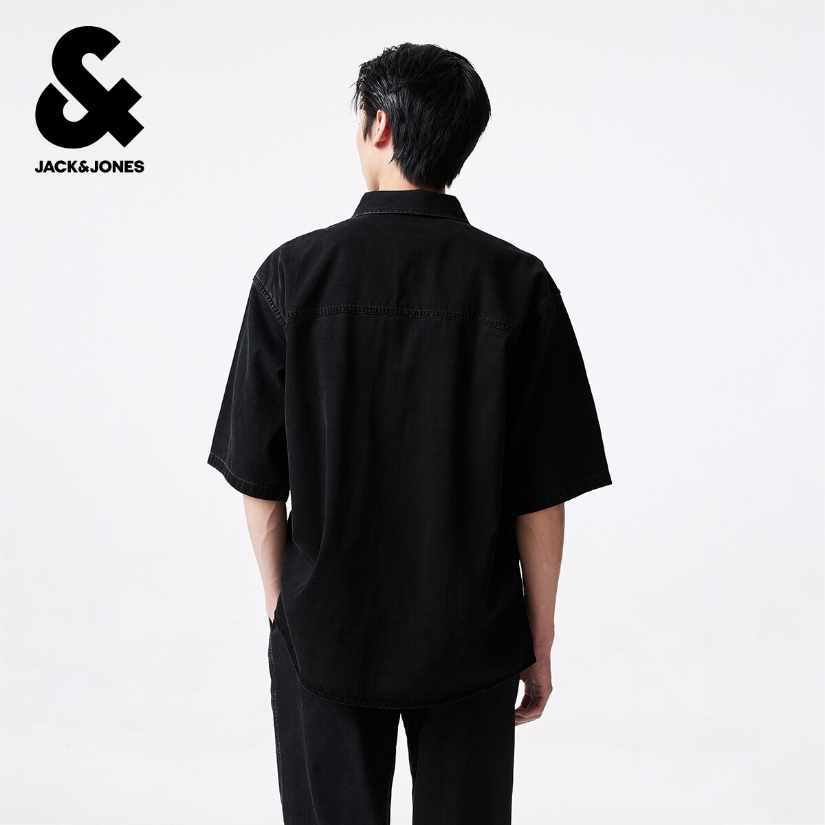 杰克琼斯男装秋季宽松翻领上衣简约时尚百搭深灰牛仔衬衫短袖外套