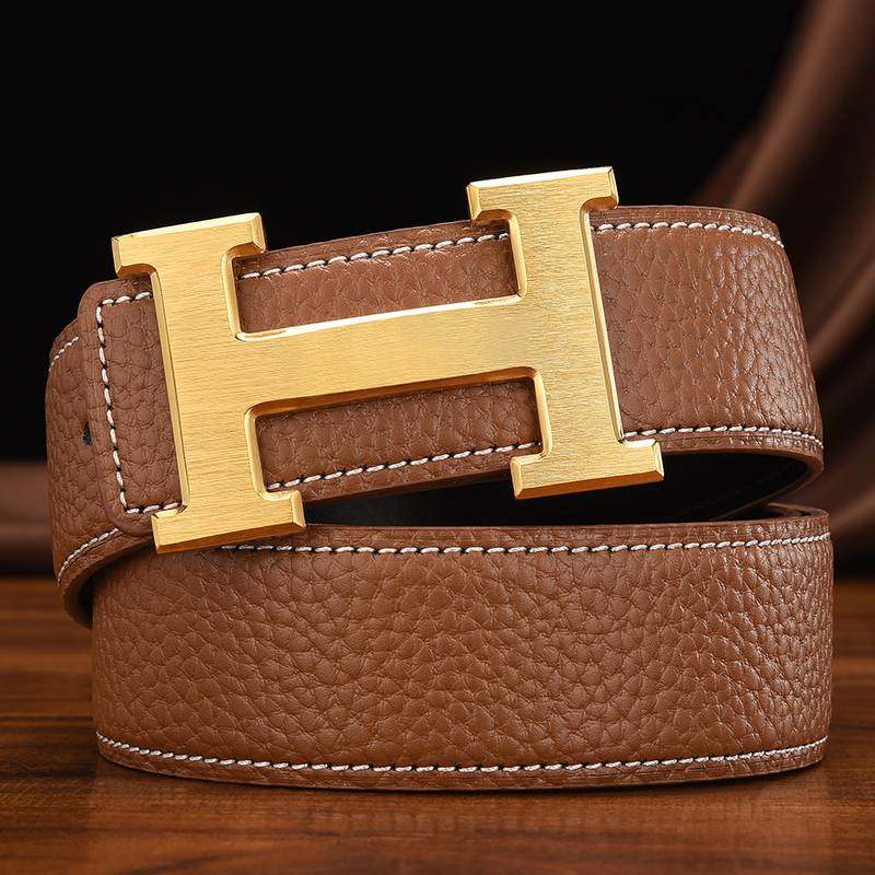爱马男仕真皮男士字母商务高端皮带平滑扣牛皮中青年年轻人铜扣奢
