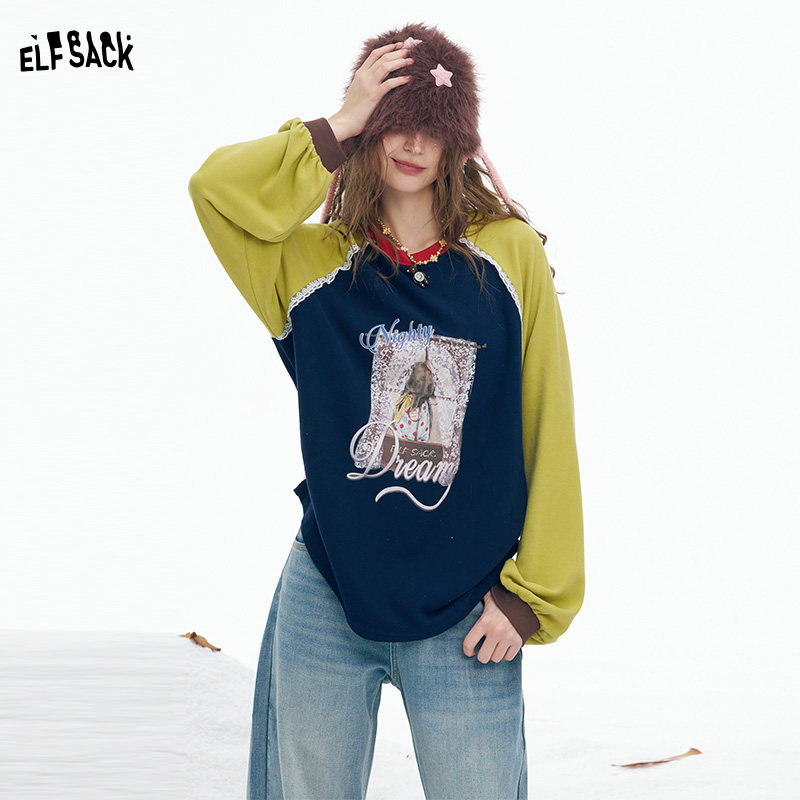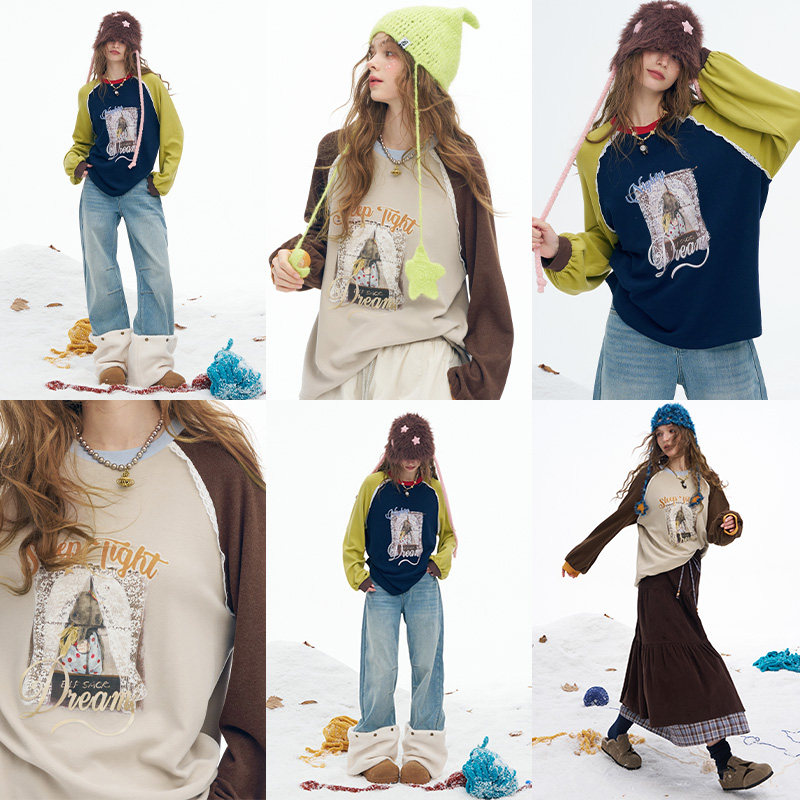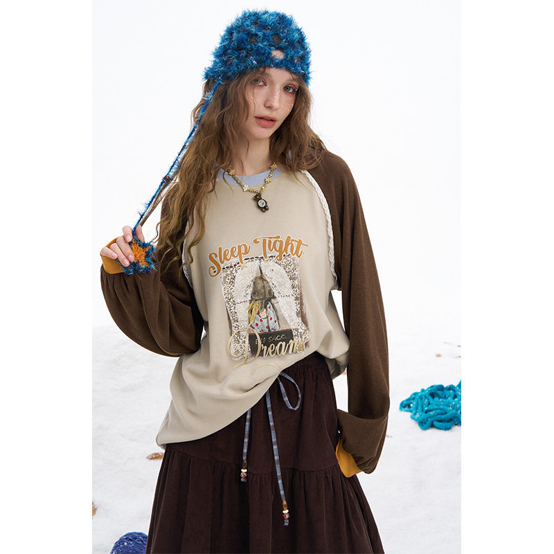 妖精的口袋撞色插肩印花t恤女2025冬新款内搭设计感小众长袖上衣