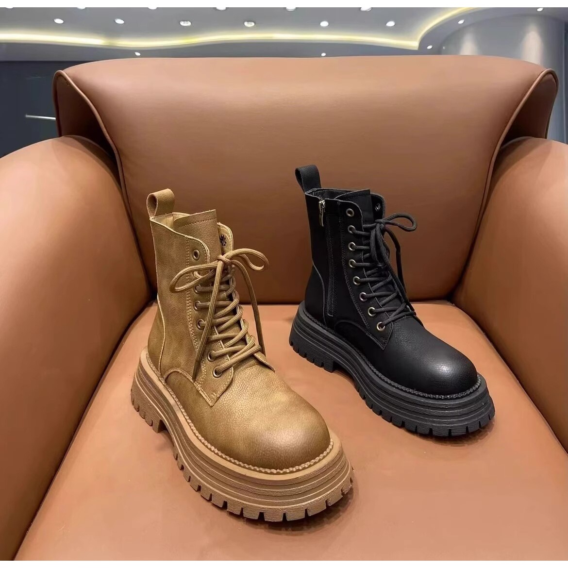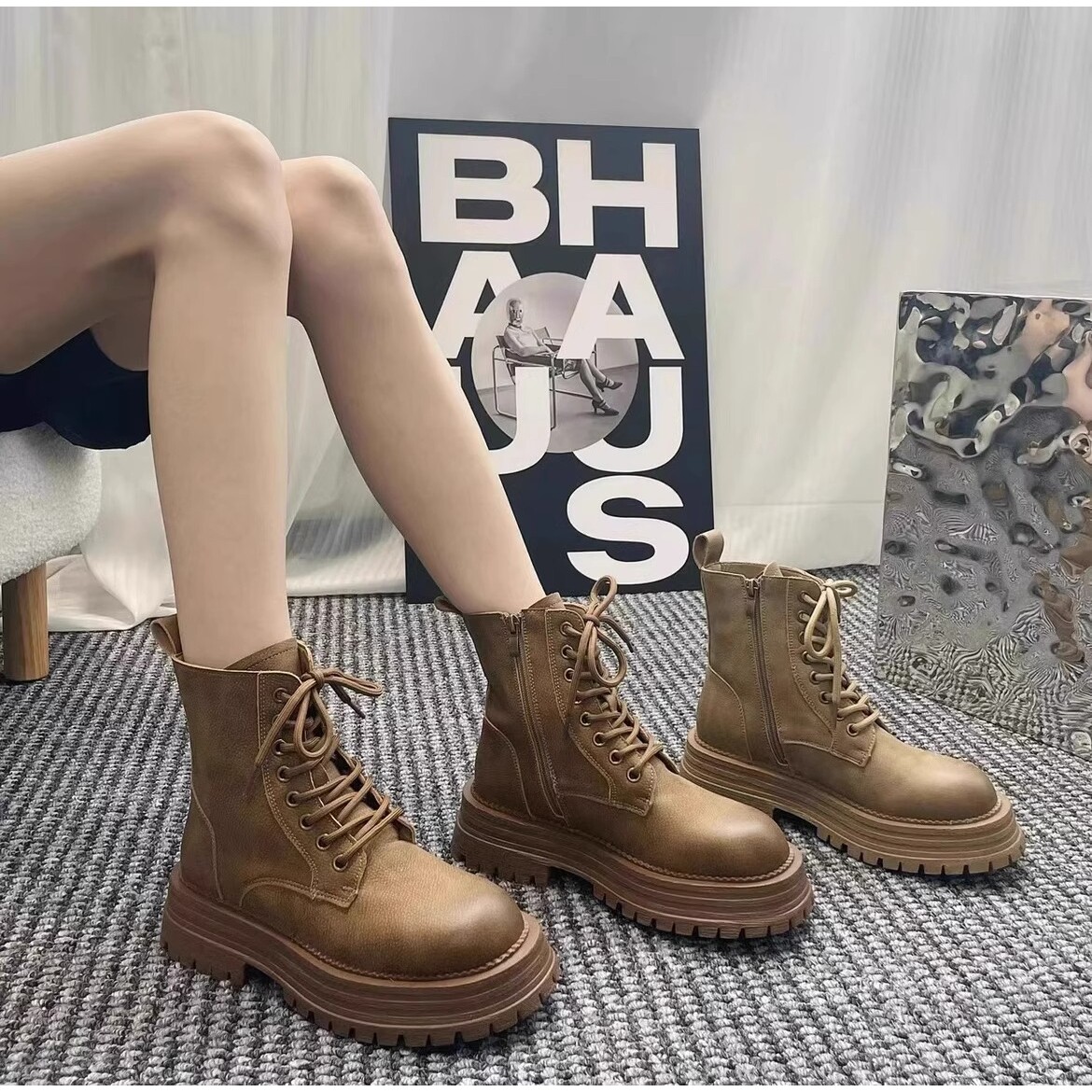 真皮版~棕色马丁靴女2025秋冬新款厚底增高短靴小个子英伦风靴子