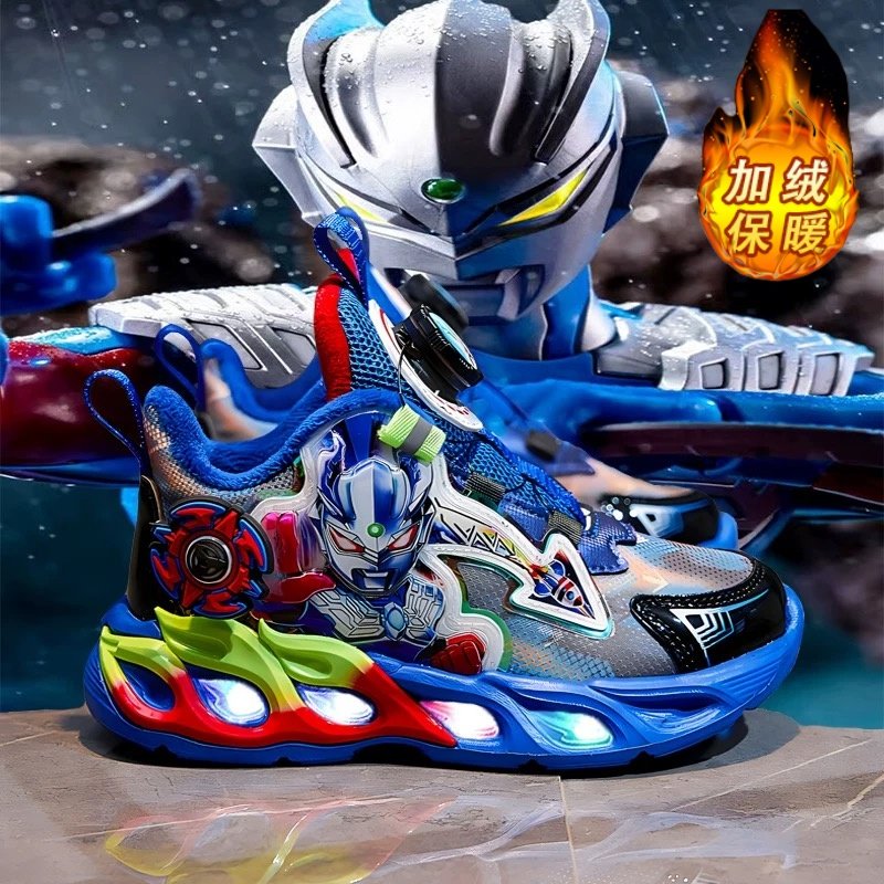 巴布豆真皮奥特男童曼鞋春秋新款旋转钮扣运动鞋透气发光灯鞋减震