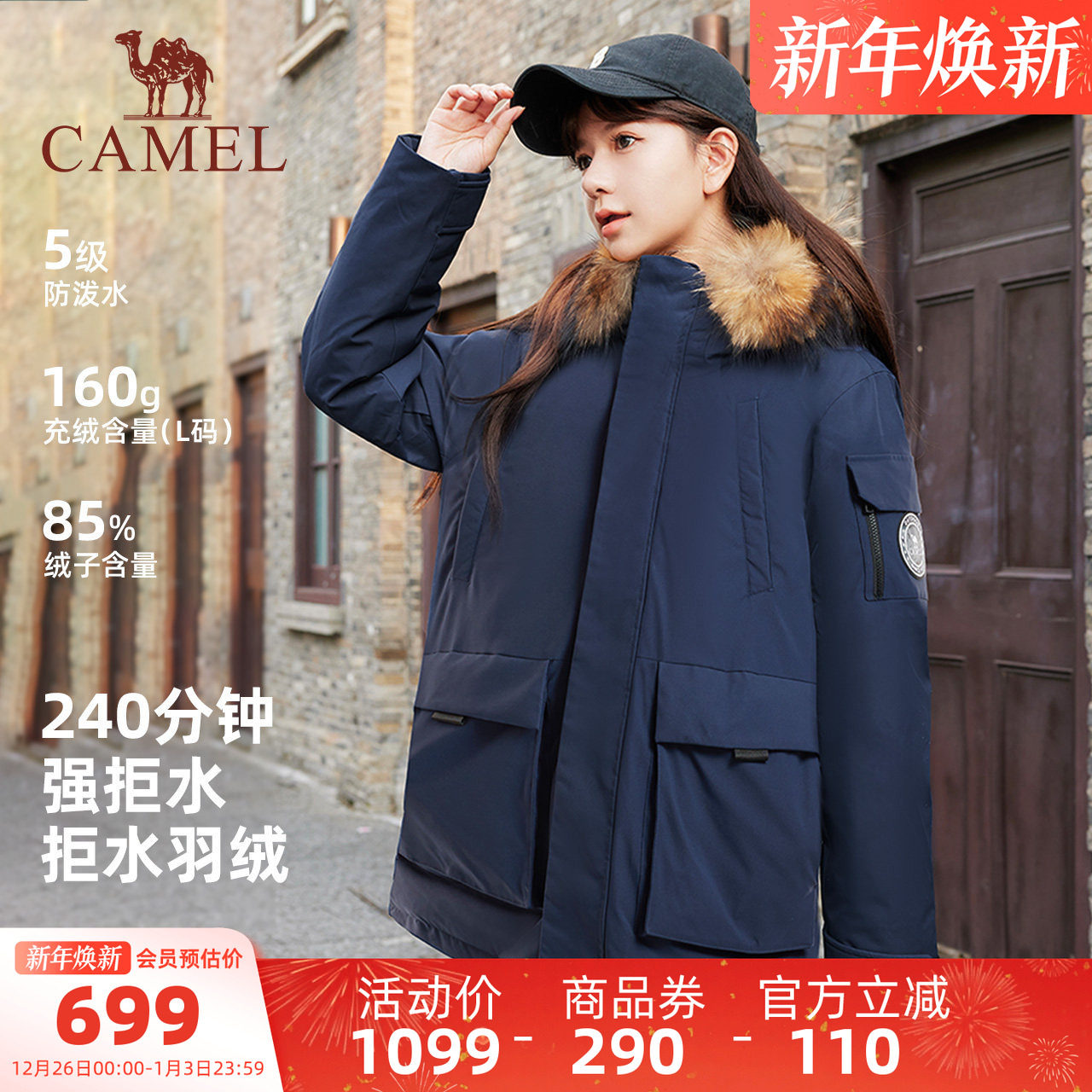 骆驼女装大毛领羽绒服女中长款2025冬季保暖防风工装派克服外套男