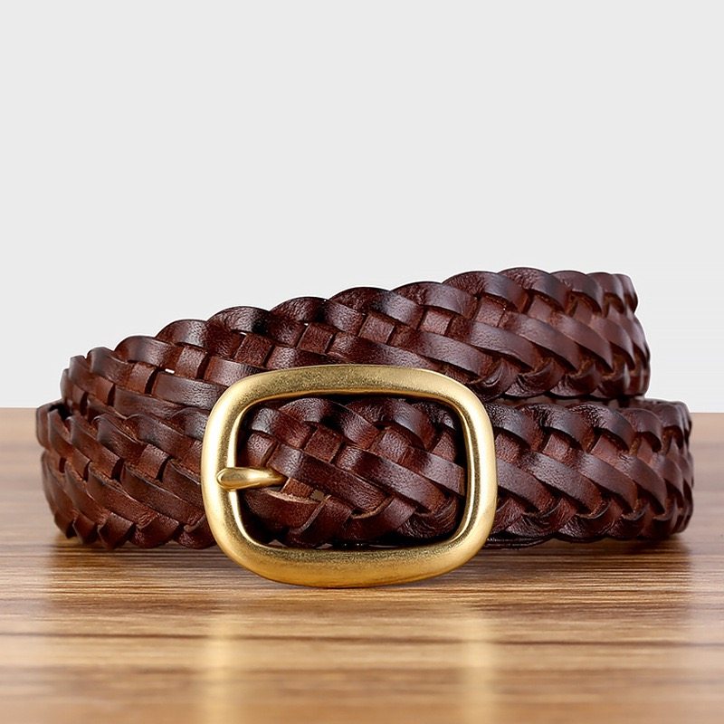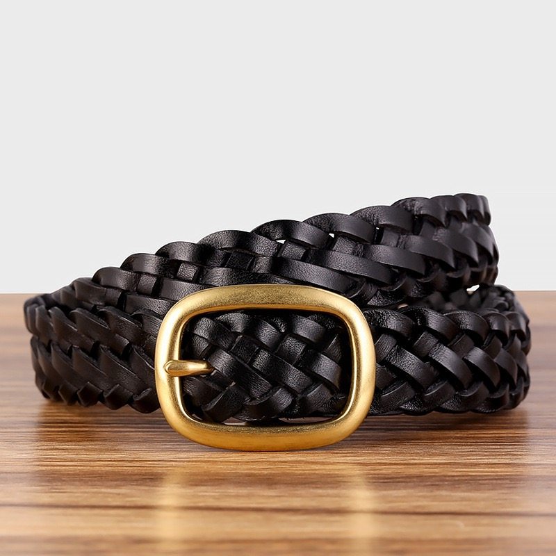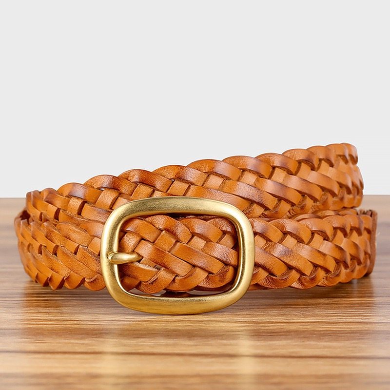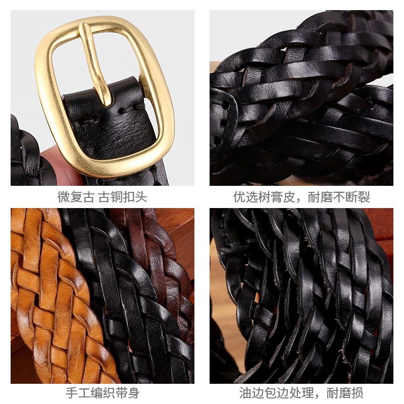 新款纯牛皮手工编织简约铜扣女款腰带头层牛皮编制免打孔女士皮带